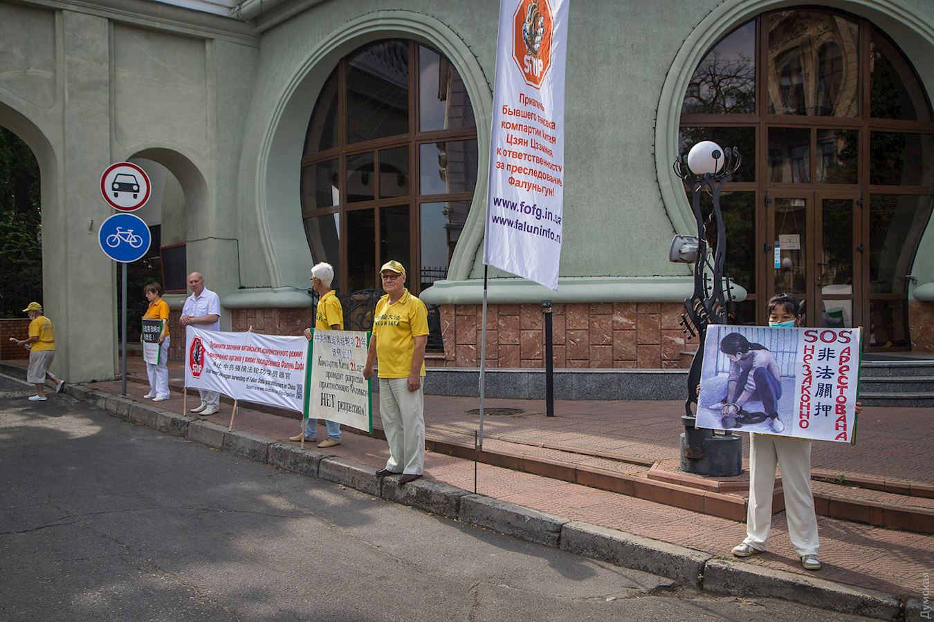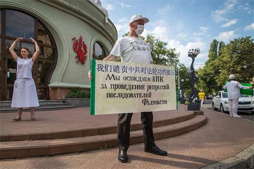 七月二十日,基辅市部份法轮功学员在中共驻基辅使馆前举行反迫害活动。受社交人数限制,当天的反迫害活动,法轮功学员轮流参加。