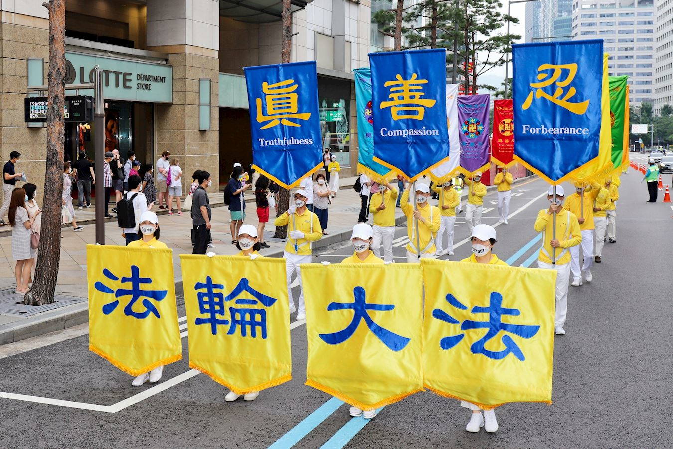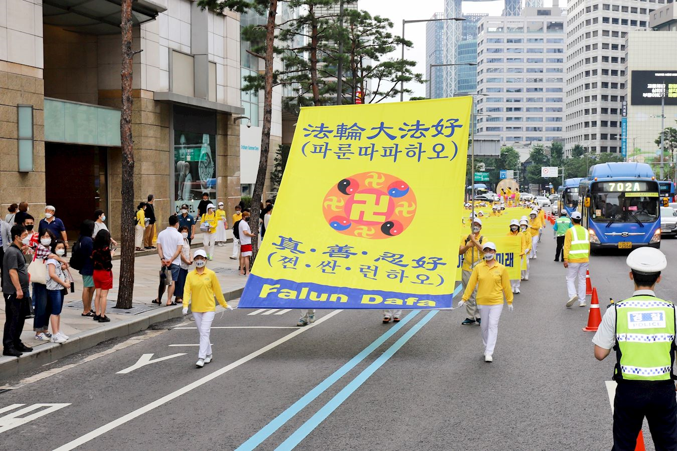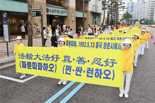 由法轮功学员组成的天国乐团,踏着威风凛凛的进行曲打头阵,展示法轮大法、真善忍的大旗,以及法轮大法大型横幅的游行队伍浩浩荡荡,身穿金黄色炼功服的炼功示范队伍,向首尔市民展示了优美的炼功动作,尤其是美丽的仙女队在花车上演示炼功的情景,令很多人驻足观赏,并纷纷拍下照片和视频,当时的场面俨然一道亮丽的风景线,为梅雨季节灰蒙蒙的首尔街道带来光明。