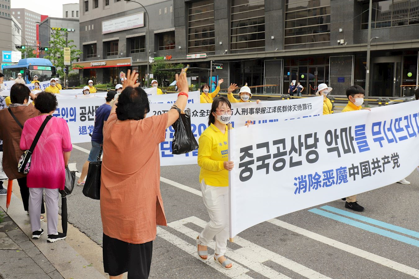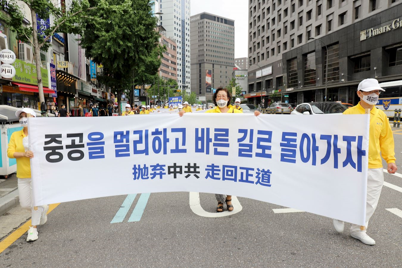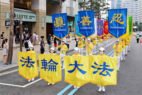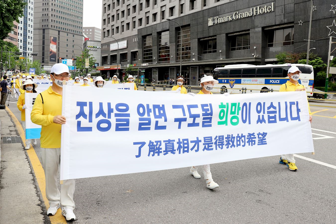 由法轮功学员组成的天国乐团,踏着威风凛凛的进行曲打头阵,展示法轮大法、真善忍的大旗,以及法轮大法大型横幅的游行队伍浩浩荡荡,身穿金黄色炼功服的炼功示范队伍,向首尔市民展示了优美的炼功动作,尤其是美丽的仙女队在花车上演示炼功的情景,令很多人驻足观赏,并纷纷拍下照片和视频,当时的场面俨然一道亮丽的风景线,为梅雨季节灰蒙蒙的首尔街道带来光明。
