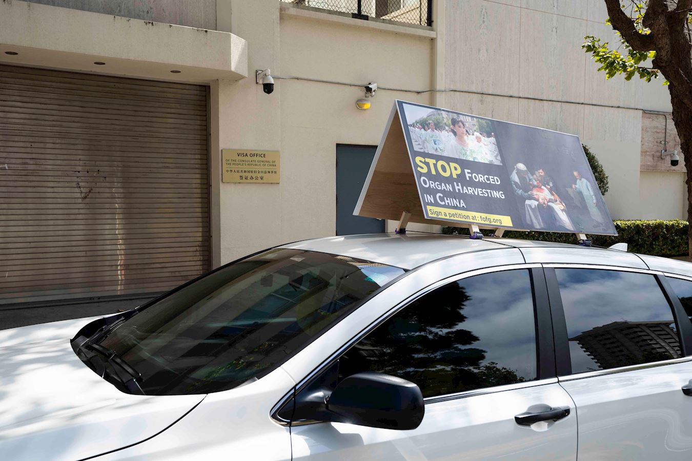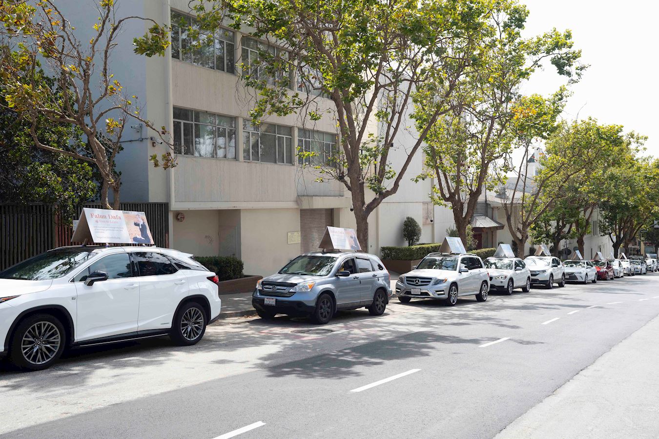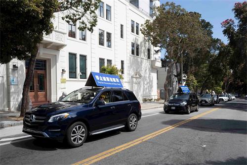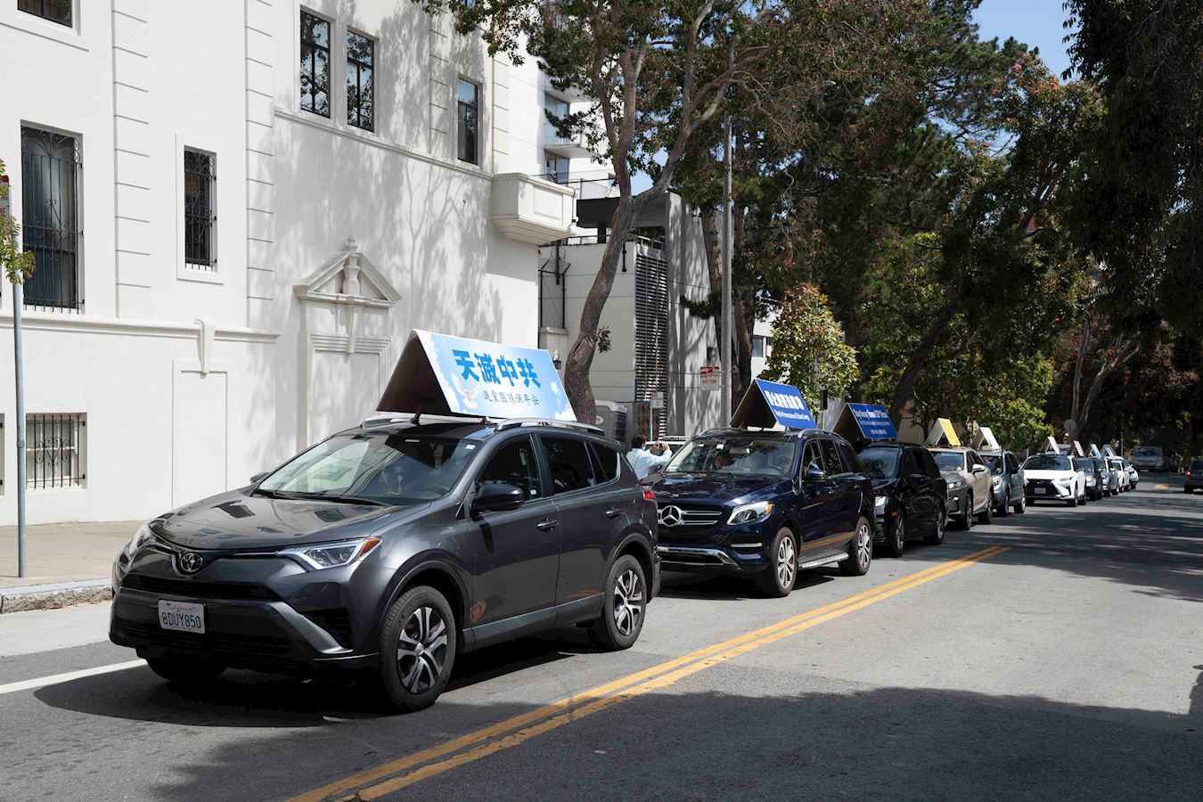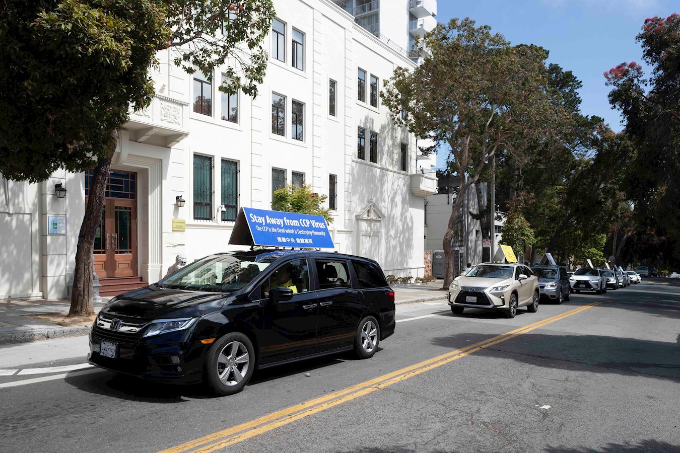 法轮功学员的真相车队从旧金山的城市大学出发,在旧金山小中国城列治文区和日落区来回巡游,之后来到中共驻旧金山领事馆,环绕中领馆,告诉世人“中共是邪灵,正在毁灭人类”、“远离中共、远离瘟疫”。