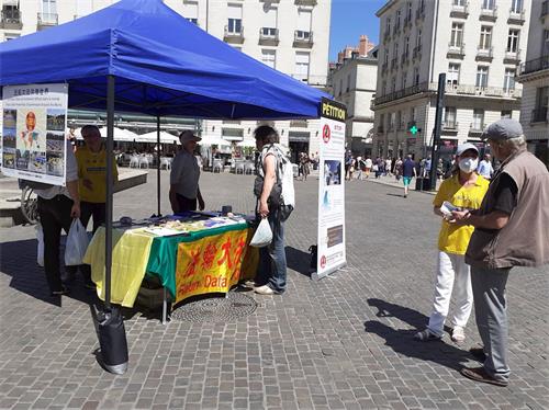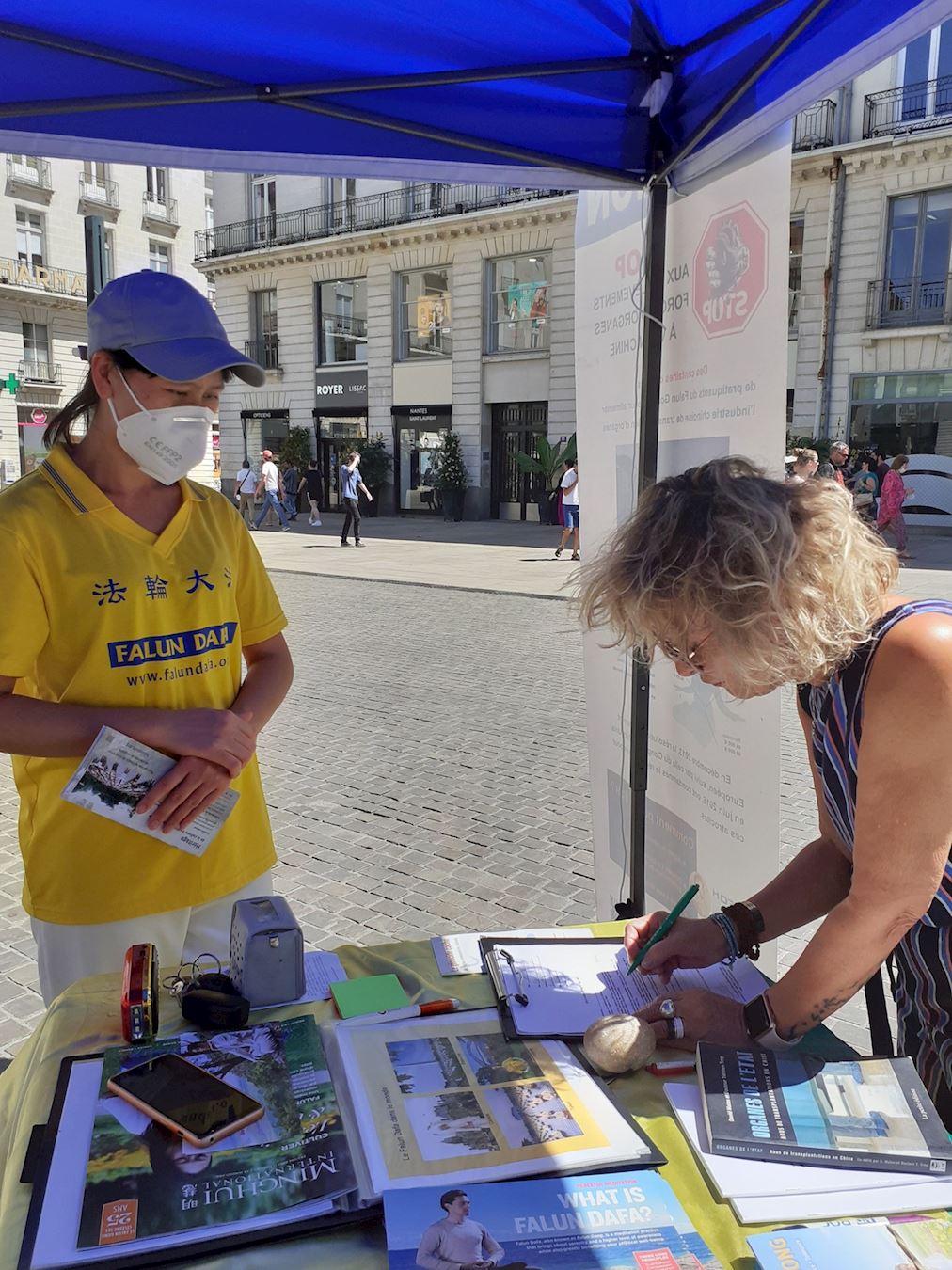 在展台旁,法轮功学员们静静地炼功场景和周围摆放的展板,吸引了很多过往行人驻足观看。展板上向民众揭示了中共强摘器官的实例,该地区的居民和一些游客看到了后很震惊,表示这是在犯种族灭绝罪。当天有近百人在二零一六年欧洲议会通过的WD48宣言请愿书上签名,该请愿书强调中共当局是全国贩卖人体器官的起源,并谴责在中国通过强行手段获得人体器官的做法。 请愿书将发送给各法国各地区的议会代表,希望当地善良的人们帮助制止这场残酷的迫害。
