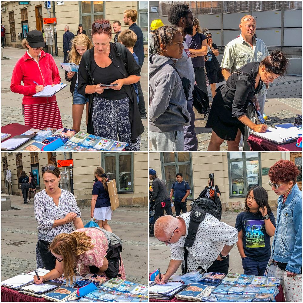 学员告诉他,签名是有用的,如果我们不把真相告诉世人,没有国际社会上善良民众的关注,那中共政府会更加肆无忌惮的践踏人权。目前瑞典已有二十九位现任和前任议员联署声明,谴责这场史无前例的残酷迫害。联署声明发起人之一的瑞典国会议员安·索菲·阿尔梅(Ann-Sofie Alm)还强调说,需要联合起来,结束这场已持续了二十一年的迫害。这些暴行必须立即停止。这个联署声明活动会持续下去的,不久在议会还要举办研讨会,将会有越来越多的人选择正义。