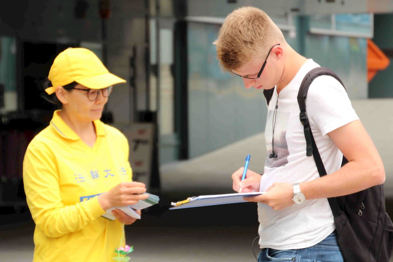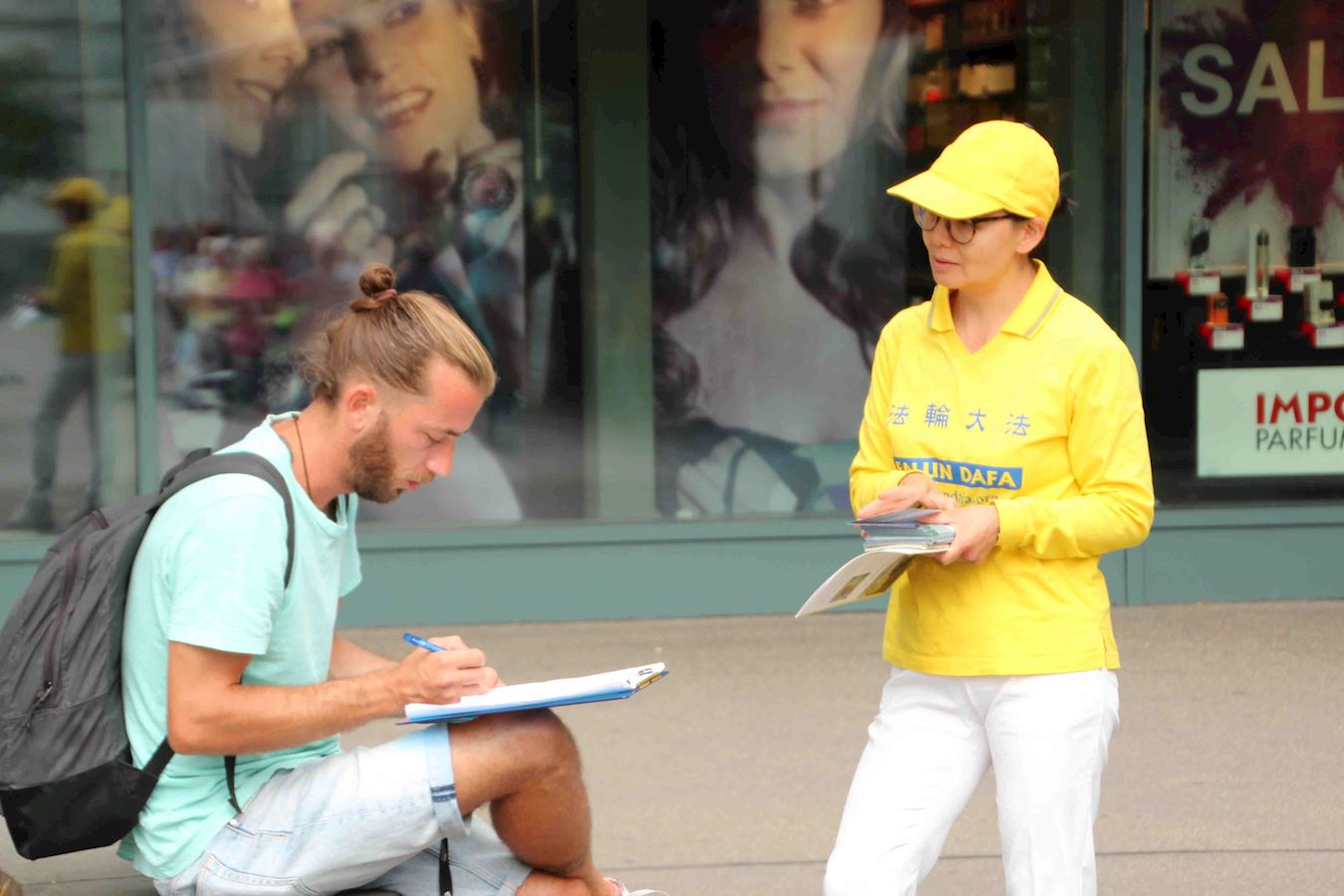 娜塔莎(Natascha)在进入商场前就收到了关于法轮功的真相资料,一看到封面上列出的中共贩卖器官的价格,她就惊讶不已。从商场出来后,她径直来到签名台,签名后她说:“我读了资料,我觉得这(中共迫害法轮功)实在是太糟糕了。”谈到中共活摘器官的罪行,她说:“我找不到言语来表达,我觉得这实在是太残忍了。”她希望通过签名:“这(签名)只是一个很小的帮助,但我希望能够起到一些小小的作用。我希望(活摘器官)这样的事情不再发生,这应该是每个签名者的愿望吧。”