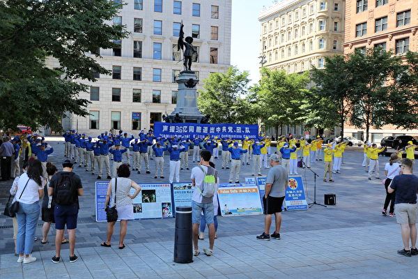 ![]() 图1~3:2020年8月8日下午,来自魁北克省和安大略省的部份法轮功学员在蒙特利尔老城的兵器广场集会,声援3.6亿中国人退出中共党、团、队。 |