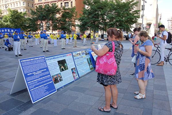 帕特纳·阿朵玺(Patenne Adolci)女士仔细阅读揭露中共活摘器官罪行、隐瞒疫情危害世界等情况的展板,并用手机一一拍摄下来。