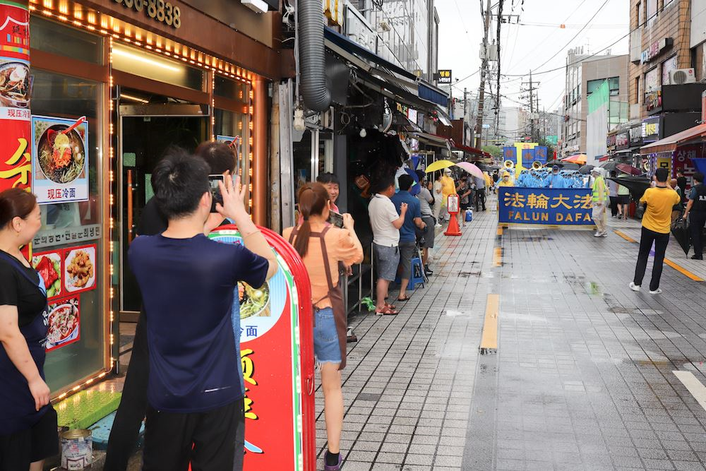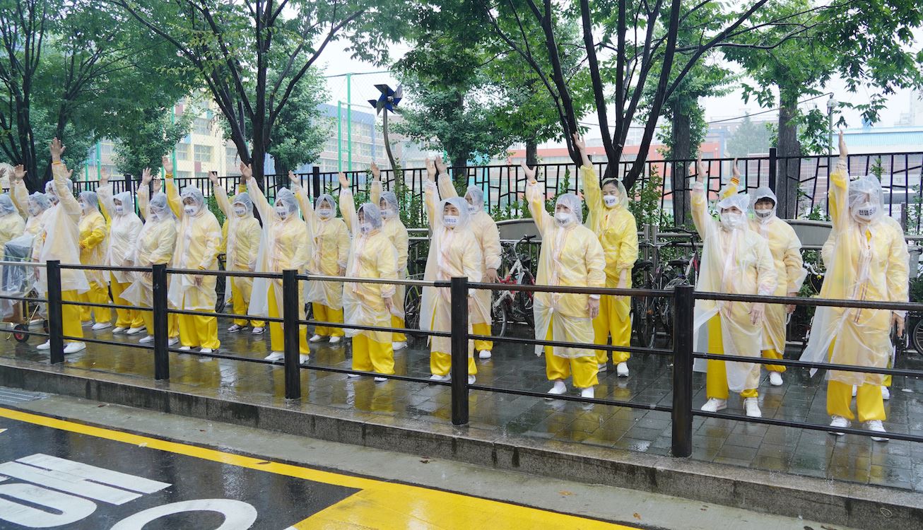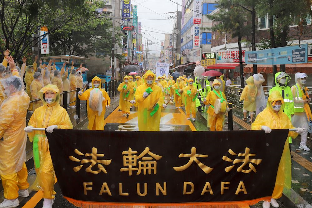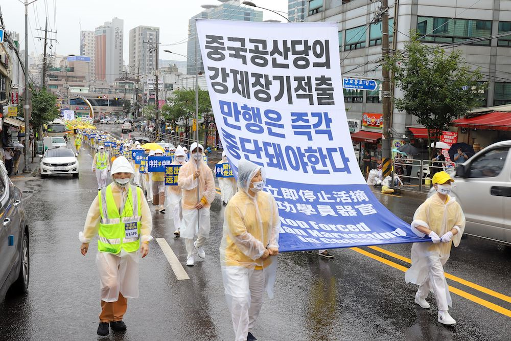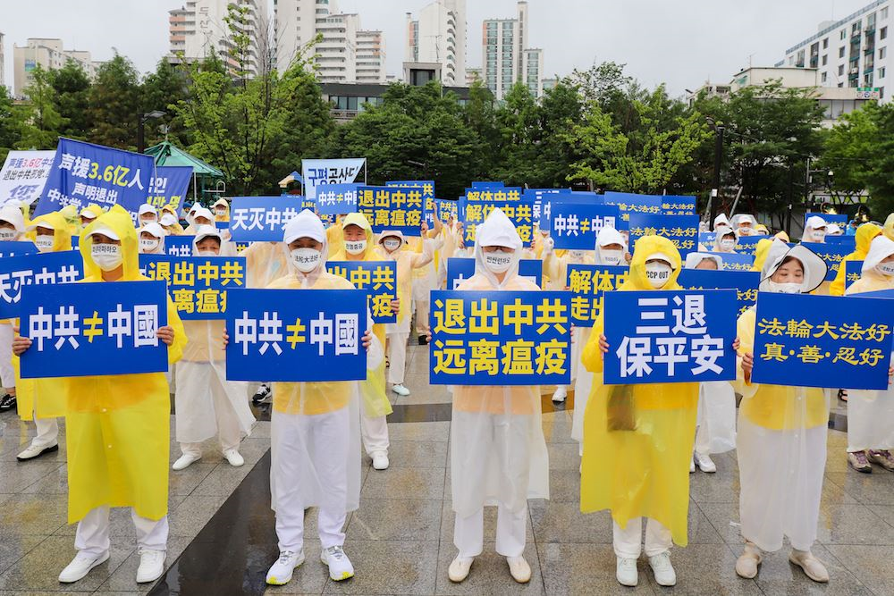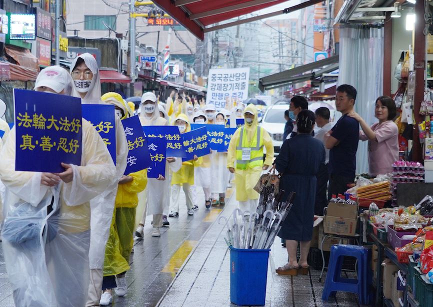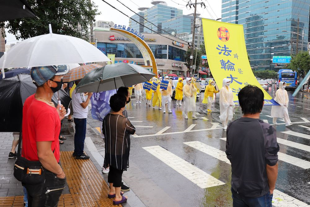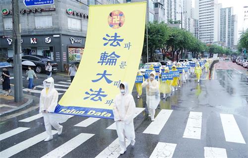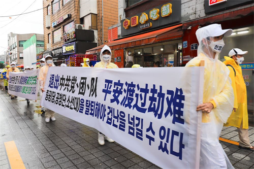 九日上午十点开始,约五百名来自首尔及周边地区的法轮功学员,在首尔九老儿童公园集会,随后冒大雨沿着韩国最大的中国城大林洞一带游行两个小时,向当地的中国人和韩国人传递了“退出中共,远离瘟疫”等讯息,为因挥之不去的瘟疫和雨灾而内心忧郁沉闷的人们带来光明和希望。