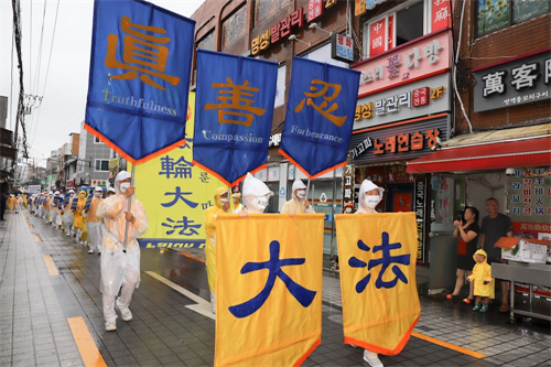 观看游行的一名韩国女士很欢迎这样的游行,她追问,“这些人是什么人?他们(让人远离中共)做的很对。”当得知是法轮功学员在游行时,她欣然地接受了法轮功介绍的传单。