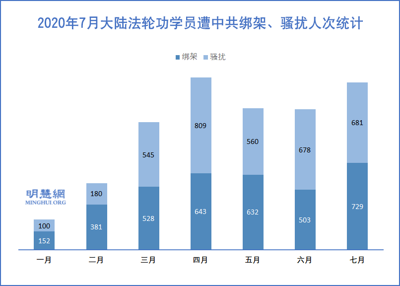 图2:2020年7月大陆法轮功学员遭中共绑架、骚扰人次统计