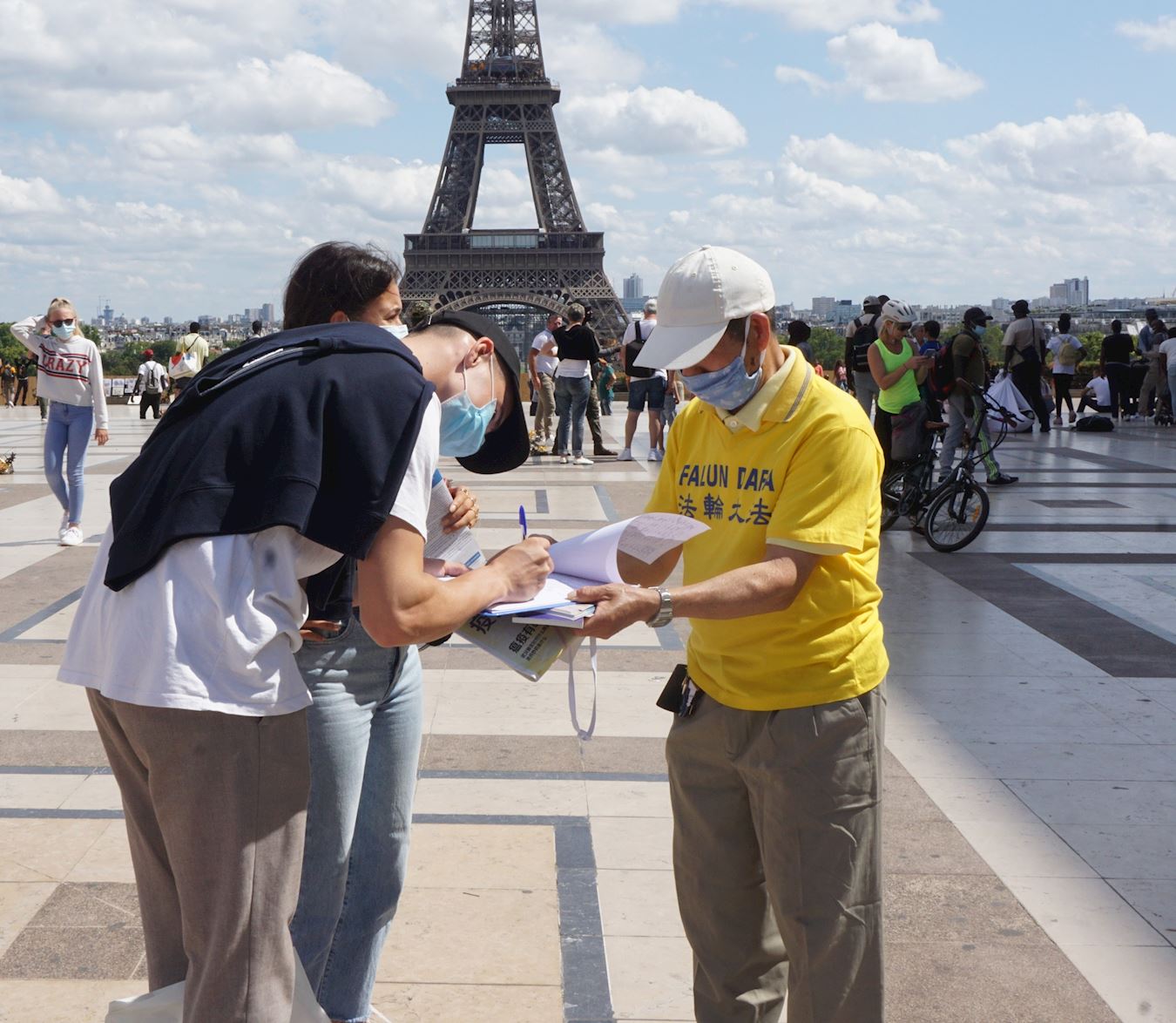 在医疗界就职的桑德林(Sandrine)和丈夫双双都在征签表上签名了。她说:“我签名了,因为我认为无论是法国、中国还是什么其他国家,人们都应该享有民主和自由。我知道中国是共产主义,但是象今天看到的这样的功法,有点像瑜伽,对人和社会没有任何危害,我认为中国政府应该给人们以自由。”