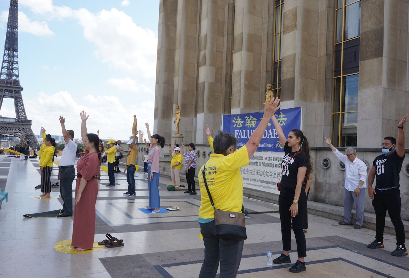 游人们被悦耳祥和的音乐吸引,驻足在巴黎法轮功学员的讲真相展台前。有的看展板,有的静静地观赏功法演示。一对年轻的法国夫妇直接加入到了炼功的人群中。