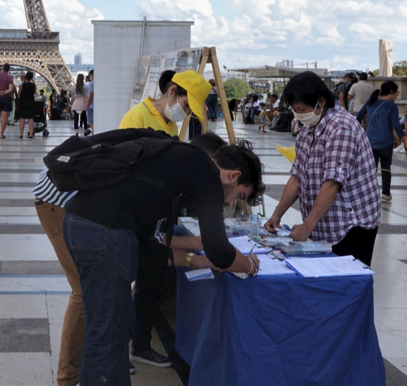 一位叫阿兰(Alain )的法律专家阅读了展板,并在制止强摘器官的征签表上签名。他说:“不经本人同意就摘去其器官,还明码标出每个器官的售价,那就是杀人!而且是杀害一个健康人,太恐怖了,什么样的医生才能做这样的事情!?”当他得知这一切都是在中共政权知情的情况下进行的,他感到愕然,他说:“我真的不明白这样一套和平祥和的功法,不会伤害到什么人,为什么会被禁止?还要被强摘器官去贩卖?我要签名阻止这种行为继续发生。”他带走了相关资料说要仔细研究。