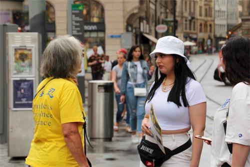 一位年长女士在骑车回家的路上看到法轮大法的信息摊位后就直接找学员要真相资料,她向学员询问了关于中共活摘器官及迫害法轮功的各种讯息。签名后,她还详细记下了苏黎世炼功点的时间和地点。她谈到自己回家后会仔细阅读相关讯息,她还表示很想学炼法轮功。还有其他的路人也询问了炼功点的讯息,表示想学炼。