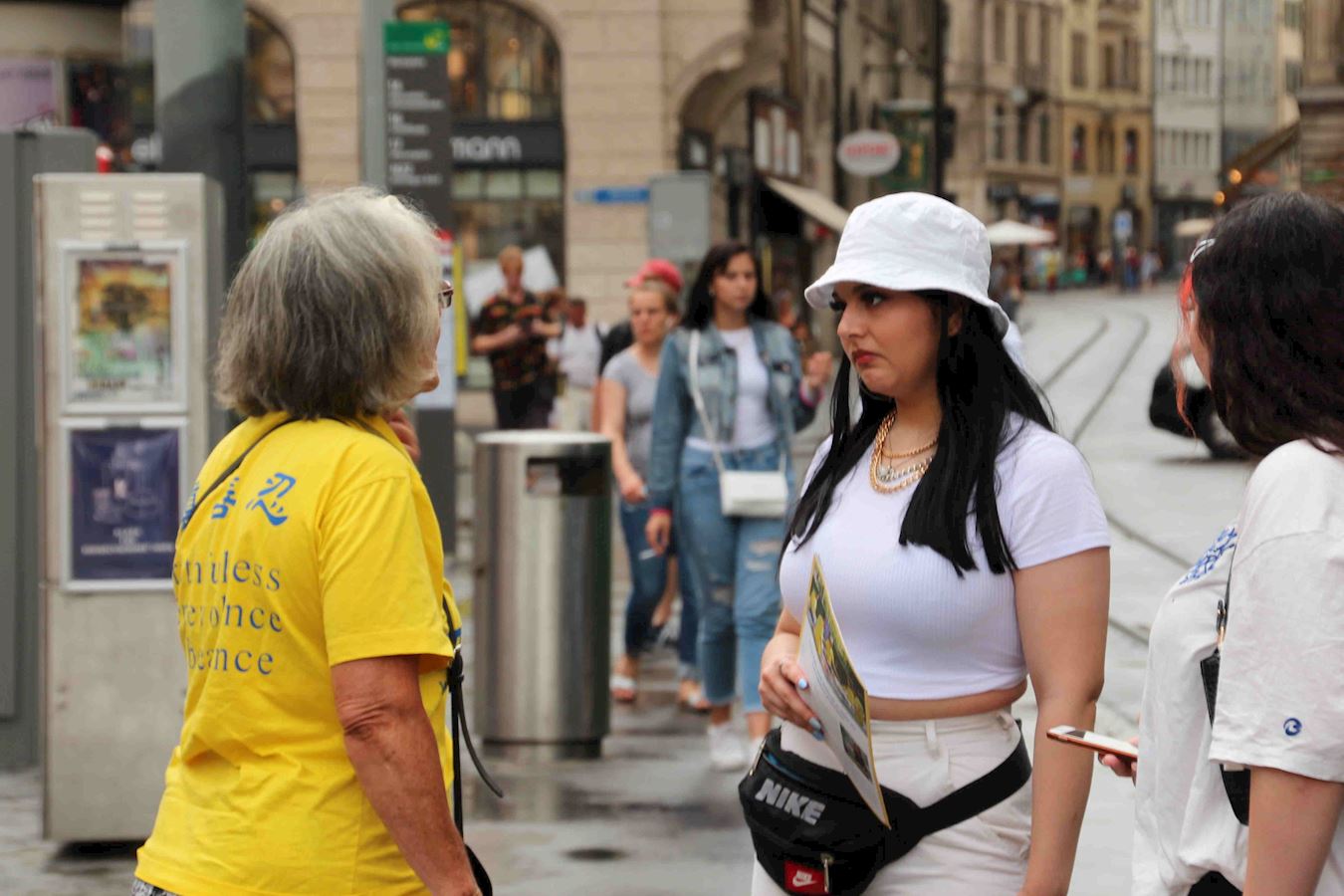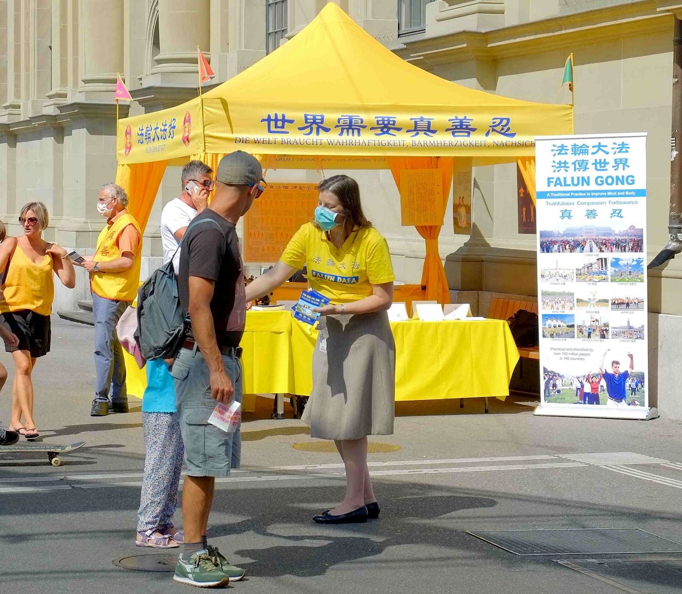 十五日当天,法轮功学员在首都伯尔尼火车站广场上搭建金黄色帐篷吸引了很多人的关注。早在学员们搭建摊位时,就有一位女士拿到真相资料后静静的阅读。她等学员们结束了准备工作后,和学员谈了很久。她自己也成立一个反对大屠杀的协会,她表示,她能想到法轮功学员的反迫害会有多难。她衷心感谢法轮功学员的付出。