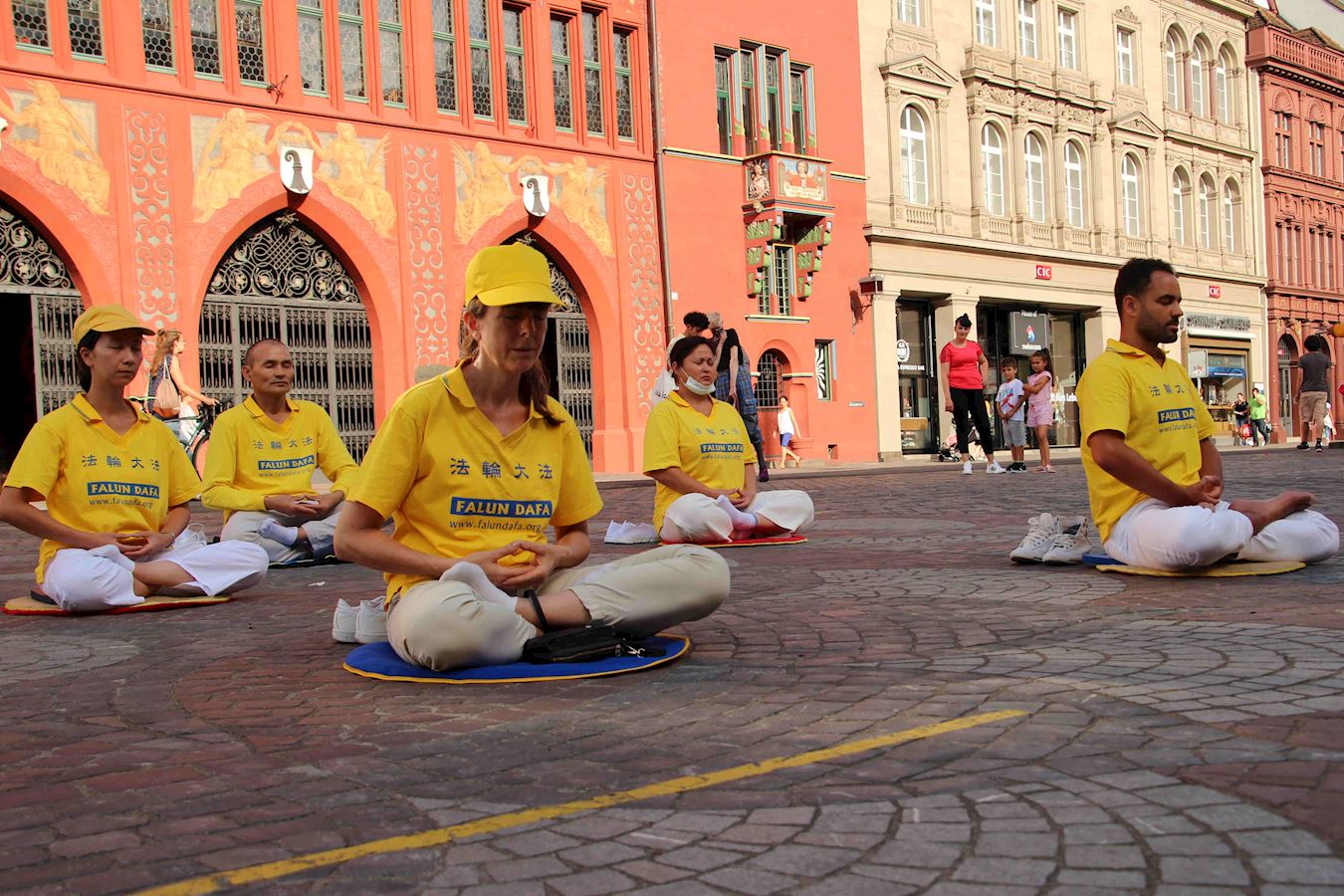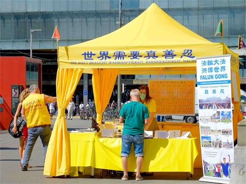 八月十四日下午,法轮功学员在巴塞尔闹市区的集市广场(Marktplatz)通过多幅展板告诉人们:大法弘传世界近三十年,世界一百多个国家和地区都有人学炼法轮功,还获得了上千个褒奖。但仅在中国,因中共惧怕人们信仰“真善忍”,能自主判断善恶好坏,因此开始了持续至今已逾二十一年的血腥迫害,甚至活摘法轮功学员的器官。信息摊位正设在当地重要的电车枢纽站前,因此也吸引了很多等电车的乘客。