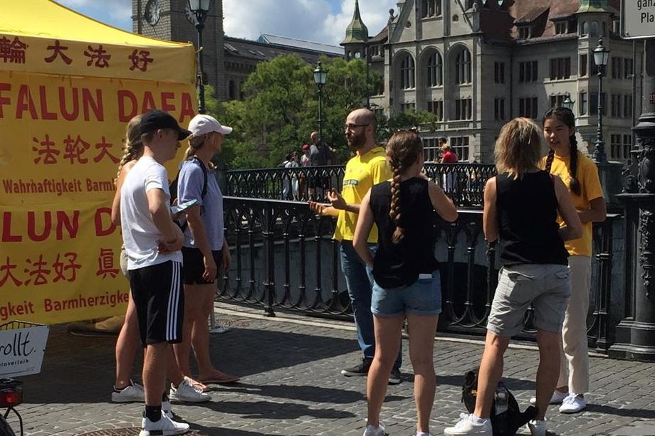 八月十五日,法轮功学员又来到了苏黎世利马特河畔(Limmatquai)发送真相资料,告诉人们法轮大法的美好,并揭露中共血腥迫害法轮功学员的罪行。
