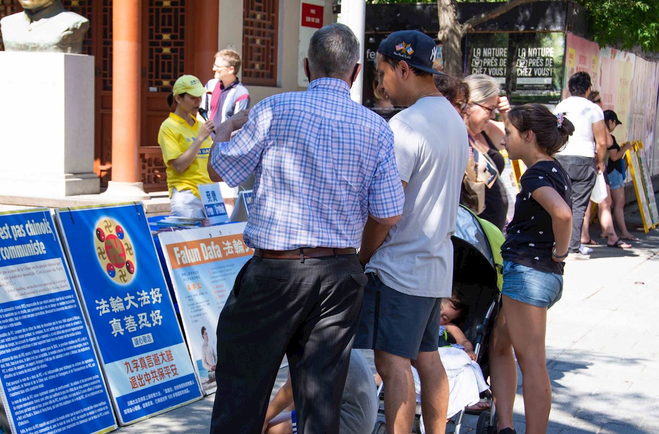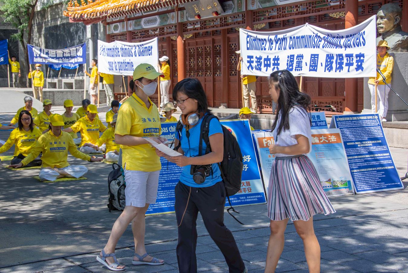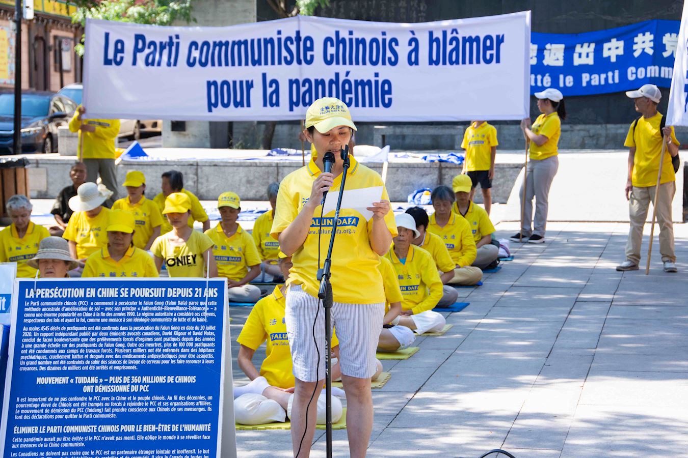 集会从下午两点开始, 在中山公园广场举行,法轮功学员,以法语、英语、中文和粤语发言,揭露中共对中国人乃至全世界犯下的反人类罪行,现场摆放的真相展板揭示中共活摘法轮功学员器官的罪行,以及中共隐瞒疫情、造成全球瘟疫大流行。
