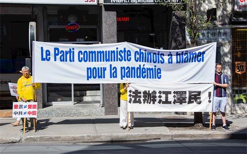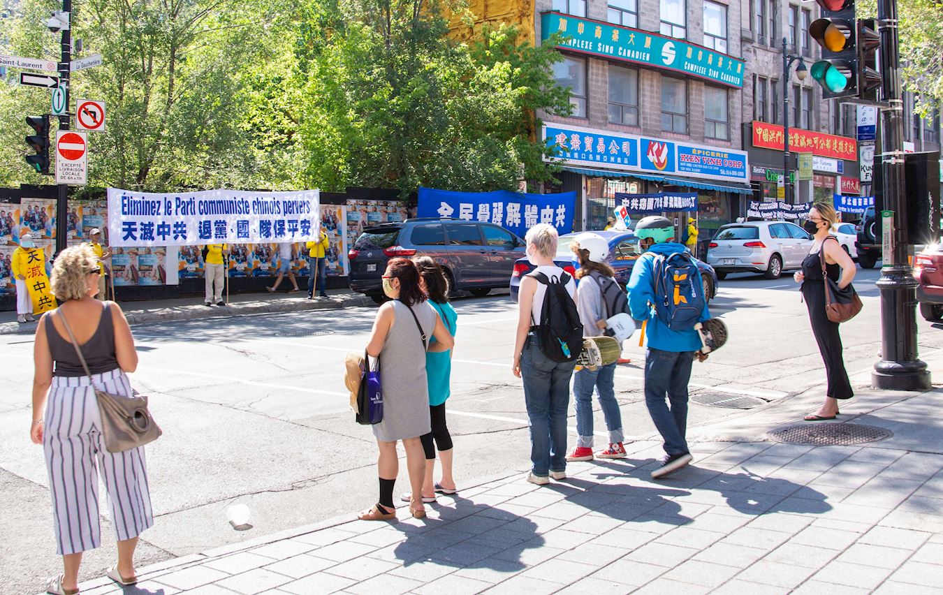 集会后,法轮功学员沿着圣劳伦大街拉起了横幅,“中共是大流行病的祸首”、“中共窃政七十年,害我同胞八千万”、“天灭中共、退党、团、队保平安”等,建起一道真相长城。