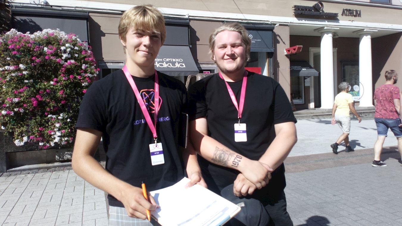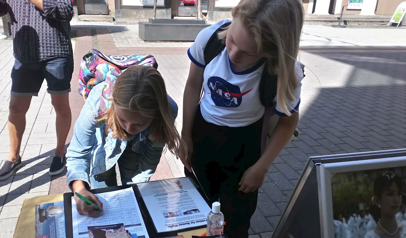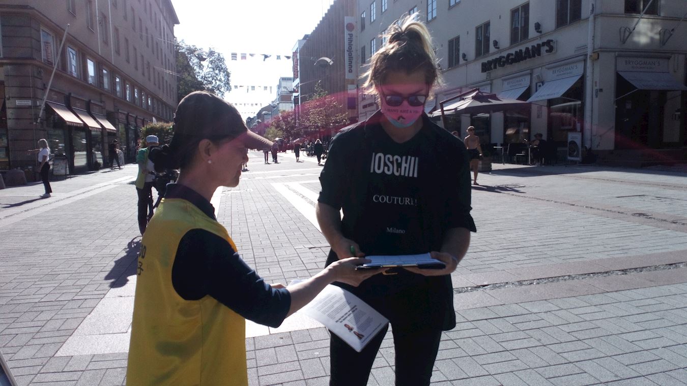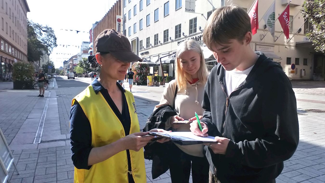 一位大约是十五岁左右的图尔库学生,她说:我上次在你们这里签过名了。我带我的朋友过来,告诉她这是怎么回事。她就翻开传单给她朋友很细致的讲起来,并把朋友带到桌子前签名。