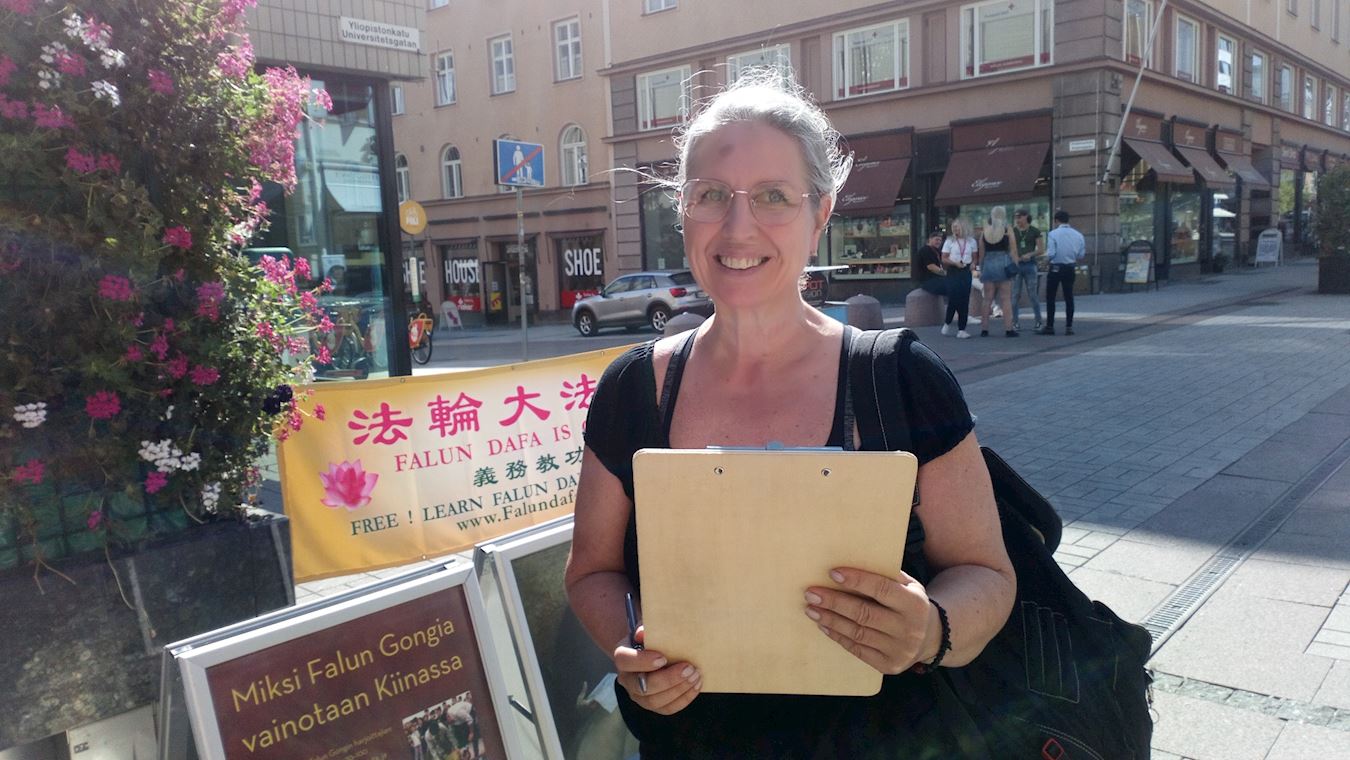 凯瑟琳(Katariina)是一位年轻人顾问,她曾经在电视节目上看过法轮功的信息。她说:“这个迫害就像当年迫害犹太人一样。人的沉默是不对的,助长了邪恶”。