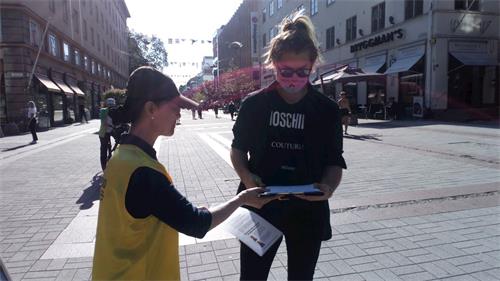非常激动的尼科问:“我可以帮你们征签吗?”他拿起征签本,请路人为法轮功学员反迫害签名。十几分钟后他征集到九个人的签名。他对路人们说:“不需要你的钱,只是希望你征签,帮忙制止中共的活摘器官罪行。”宋雅担心别人不明白,就拿着活摘器官的传单给人家看。宋雅对学员说:“尼科真是被你们感动了。”
