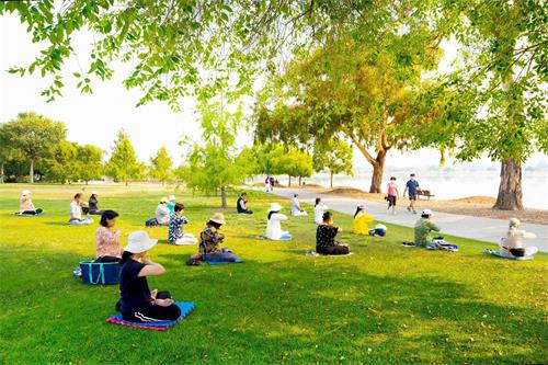 '图1~3:法轮功学员在佛利蒙中央公园伊丽莎白湖畔炼功'