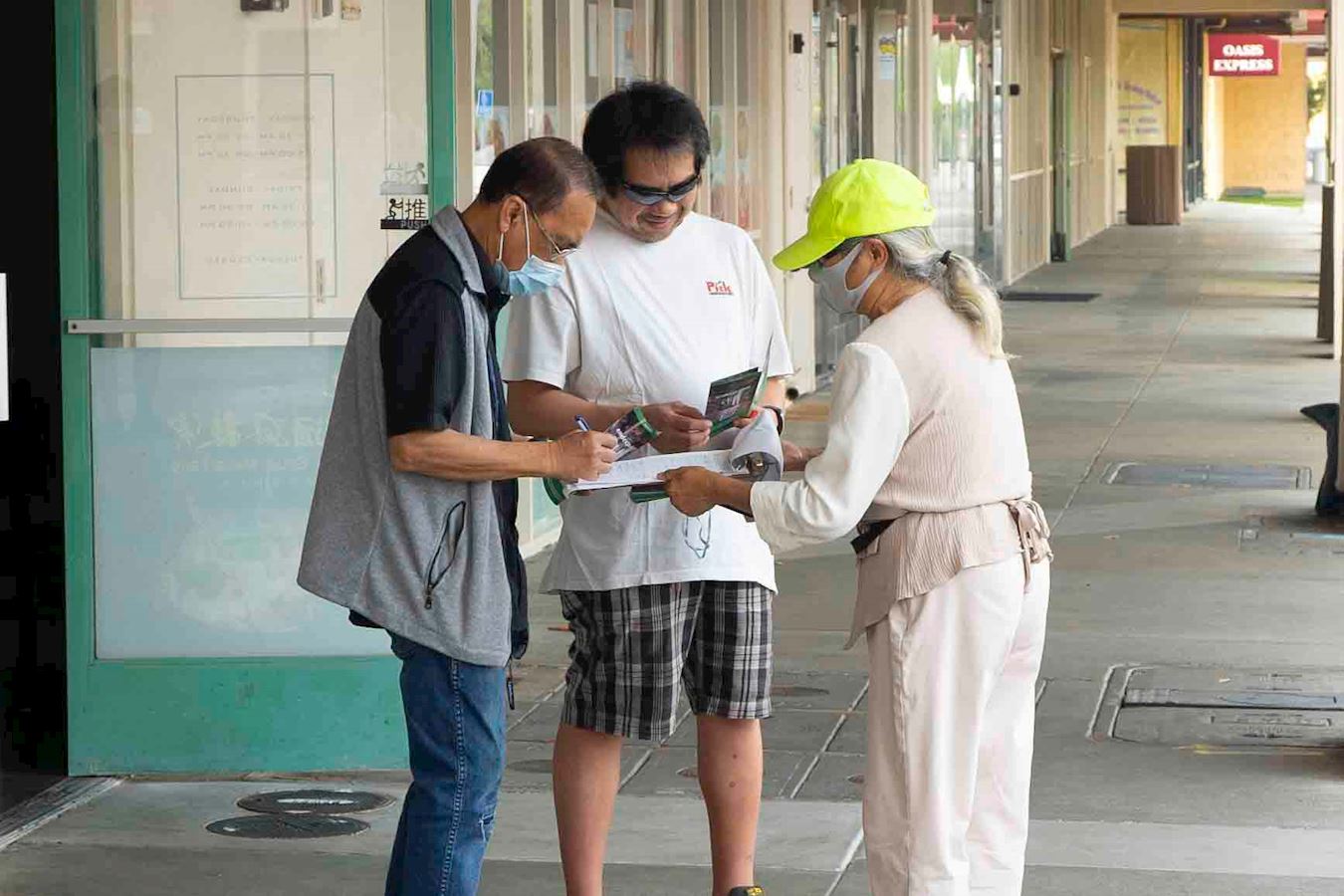 图11~12:华人超市的顾客在拒绝中共的征签簿上签字