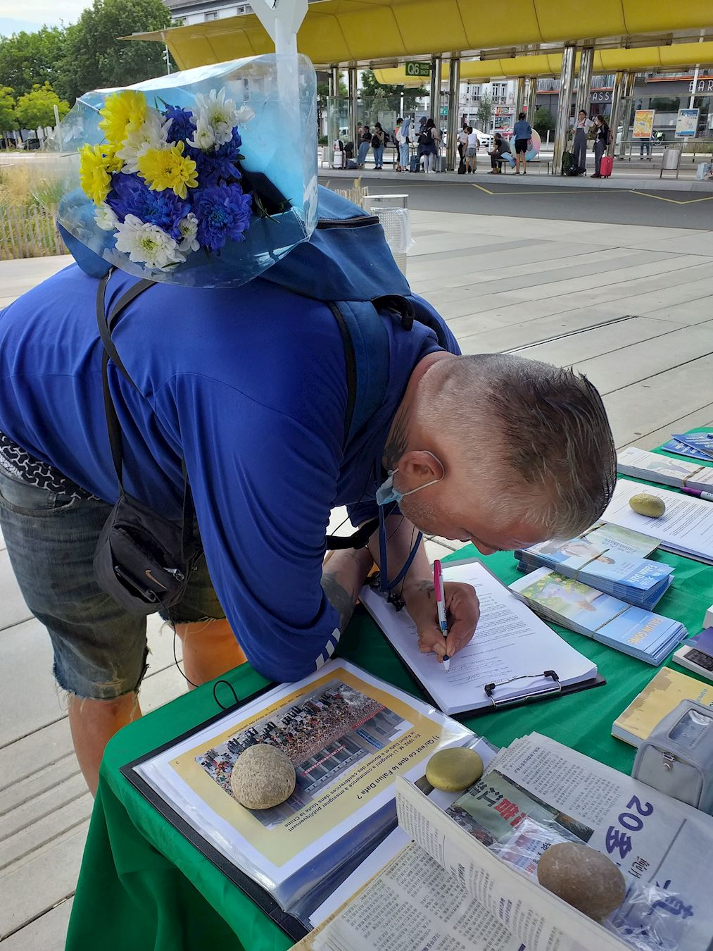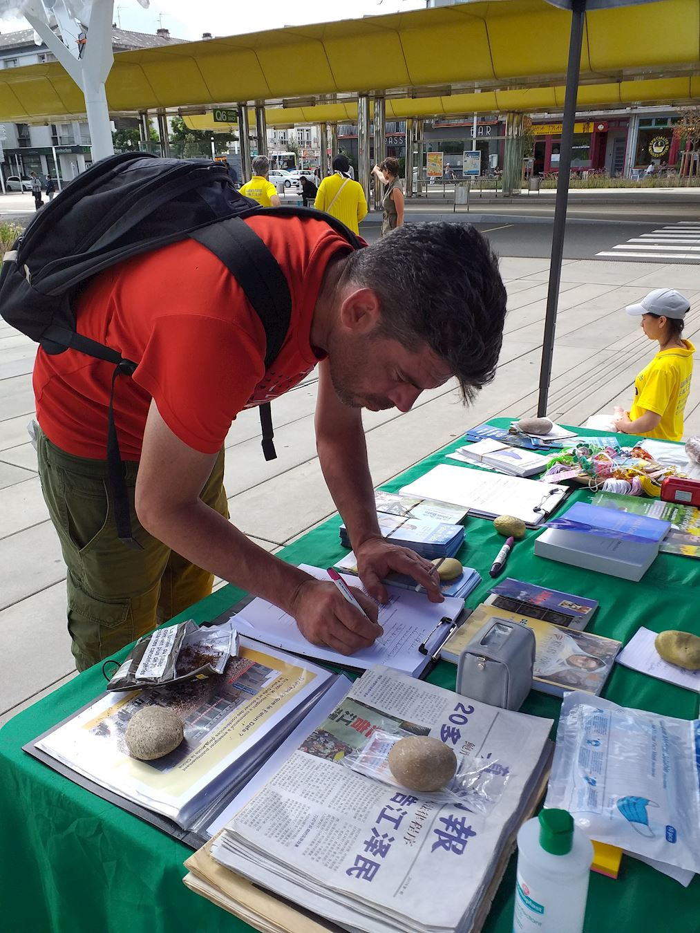 一个年轻的学生在南特车站等车时,特别来信息台了解情况。法轮功学员向他介绍了中国形势的真相后,他说:“我完全认同法轮大法的所有价值观,我们必须保留下这个源自内心的价值观。”法轮功学员鼓励他恢复对人的希望和保持自己的本色,回归“真善忍”。他离开展台时向法轮功学员表示感谢,并签名反迫害。