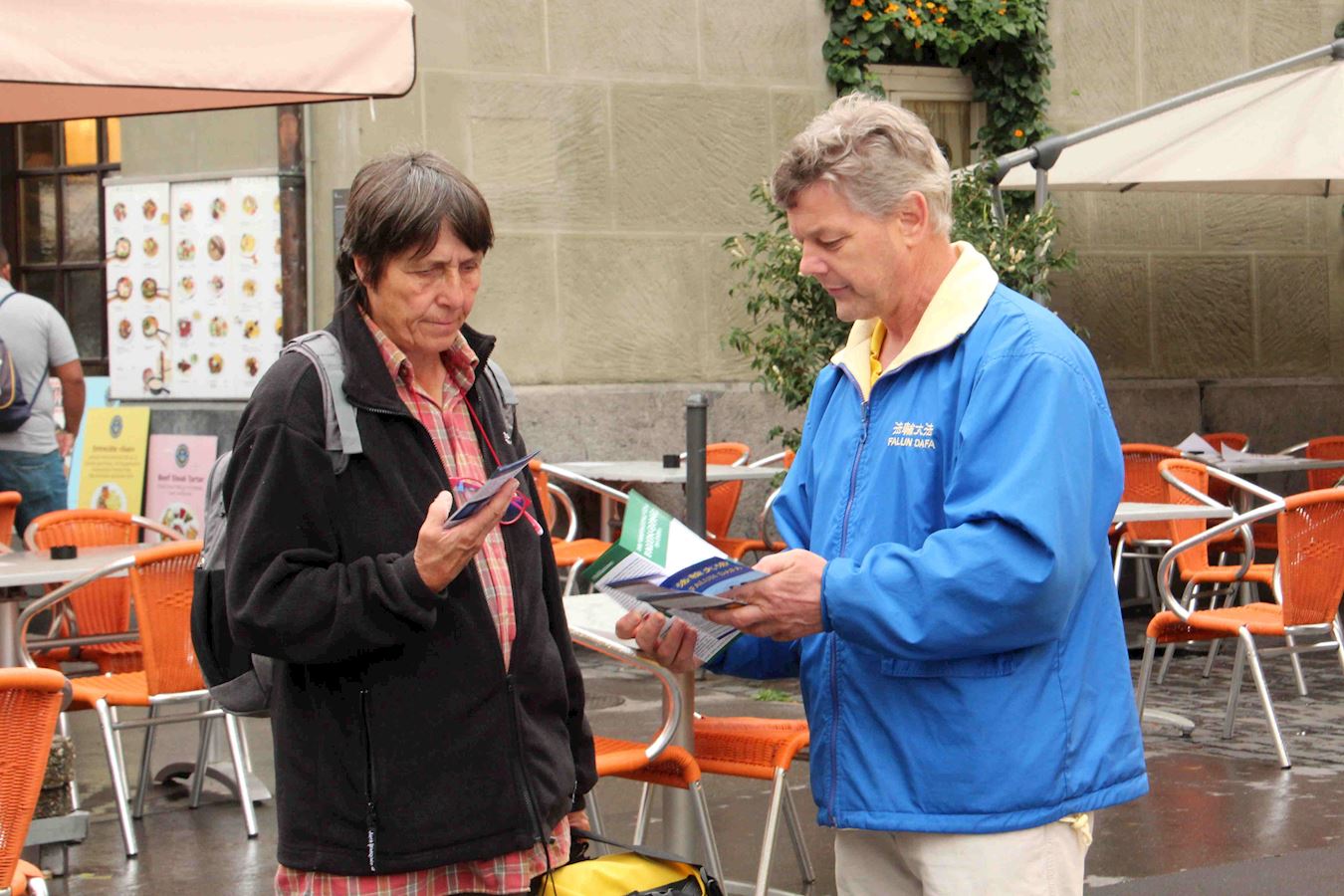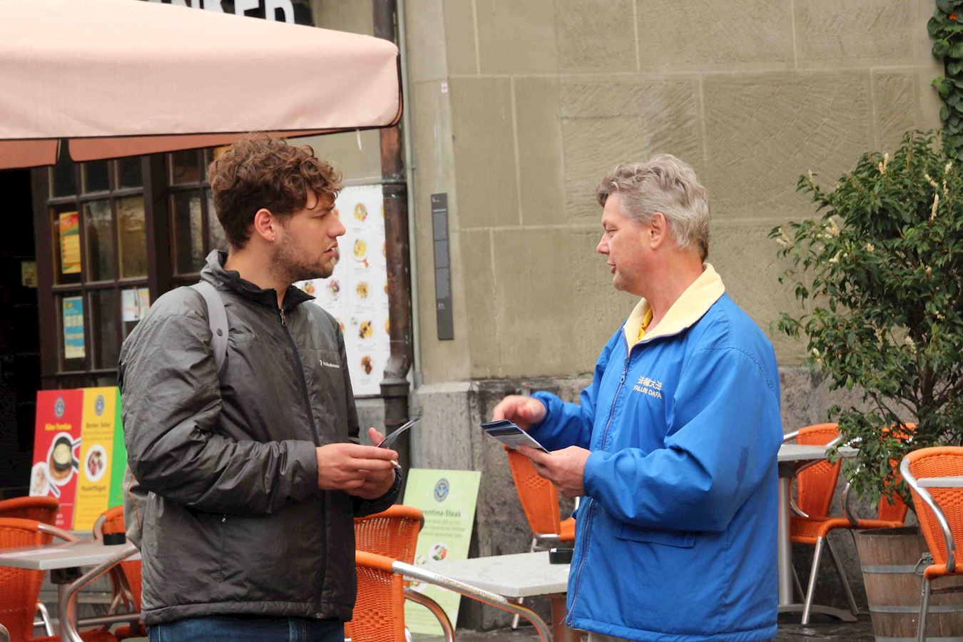 老水手汉斯(Heinz)曾在伯尔尼的景点玫瑰园(Rosengarten)的炼功点上见到过法轮功学员,并和他们讲述过自己在文革期间航海至中国,亲身经历中共独裁专制的所见所闻。在信息日的当天,看到认识的学员,他像老朋友一样来打招呼。