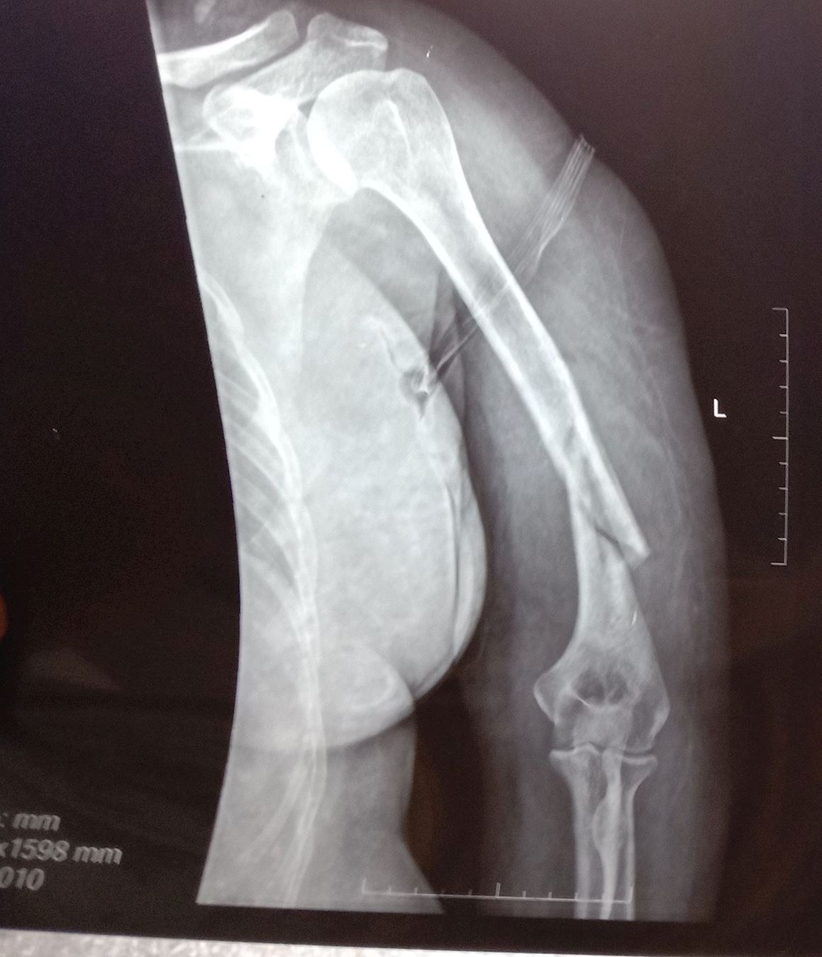 2014年4月21日,公婆把高翠莲送到石林县人民医院,检查被警察打伤不能动的胳膊。拍片子检查结果是;螺旋式粉碎性骨折。医生说,要马上住院,进行手术治疗。家人身上没有那么多钱,只好回家。