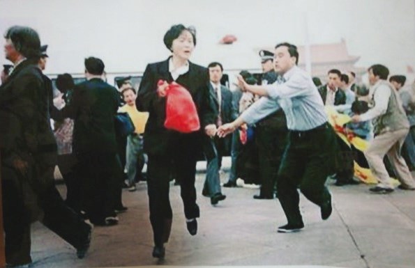 陈春美女士二零零零年九日三十日在天安门广场高喊“法轮大法好!”被便衣警察追击的现场照片