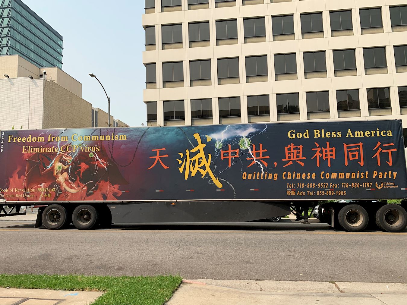 ![]() 图6:集会当天,法轮功学员制作的印有真相横幅的大卡车在洛杉矶中领馆前绕行,传递真相。 |