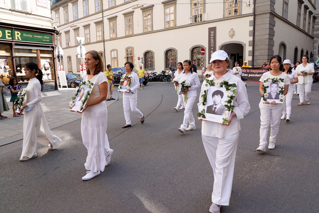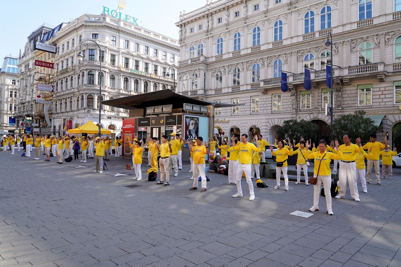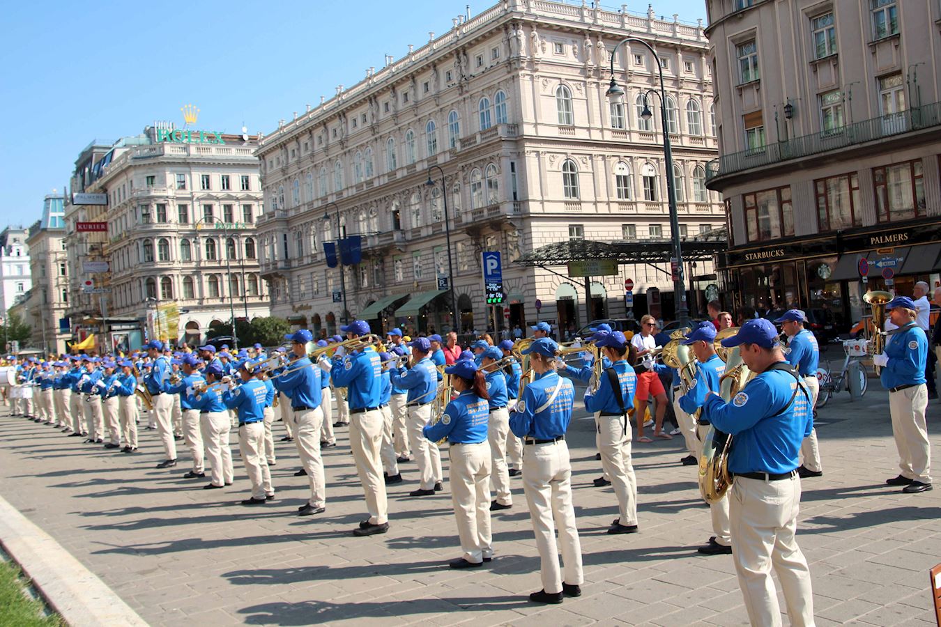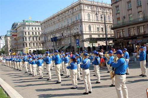 下午,由警察开道,天国乐团打头阵,法轮功学员开始了在维也纳市中心的游行,继续传递法轮功的真相。这是当地自疫情爆发后第一次批准的游行。