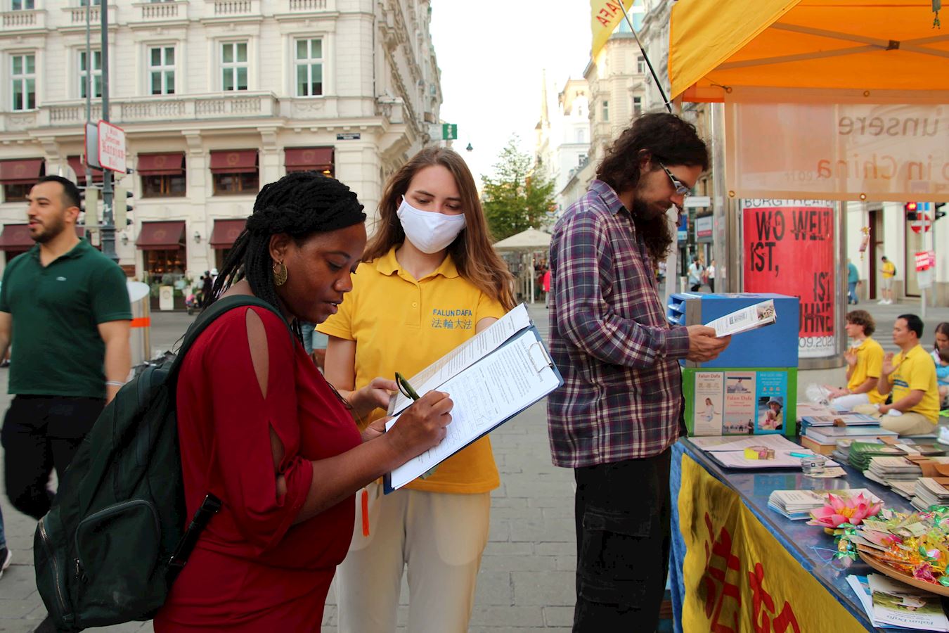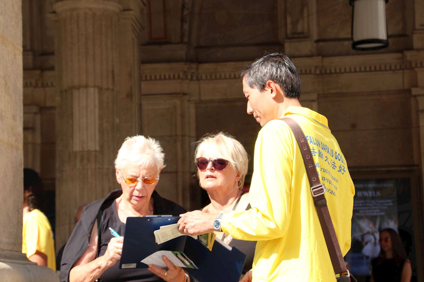 西弗里卡亚(Yasin Sivrikaya)和霍林格(Anna Hollinger)是两个二十出头的大学生。在签名后他们还继续读着拿到的真相资料。主修心理学和哲学的霍林格认为:“签名可以让人们来关注,帮助制止迫害。”