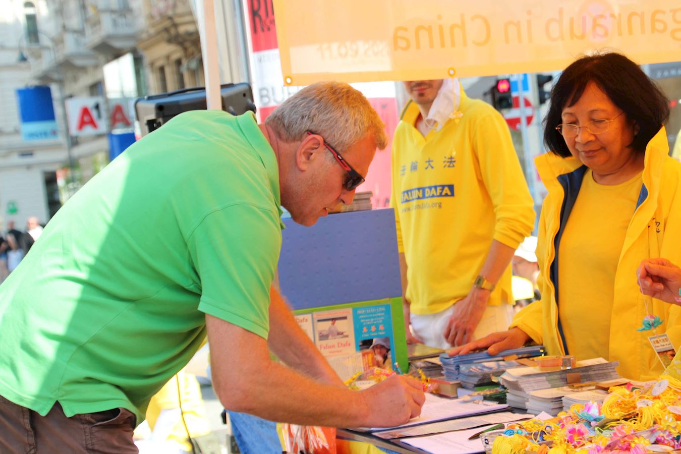 曾经在美国德州居住,现居维也纳的迈尔夫妇前些日子在法轮功学员的信息日活动上了解到法轮功,并且知道此次的游行活动,因此特地前来观看。当看到真人模拟演示活摘和酷刑迫害的场景,迈尔太太(Helga Mayr)对先生惊呼:“看,这是多么残忍恶心啊!”迈尔先生(Willi Mayr)回应道:“哦,我们可得对此做点什么(制止这迫害)!”