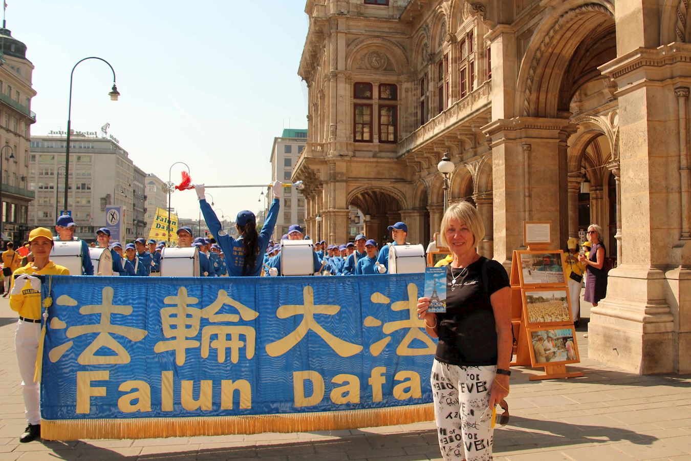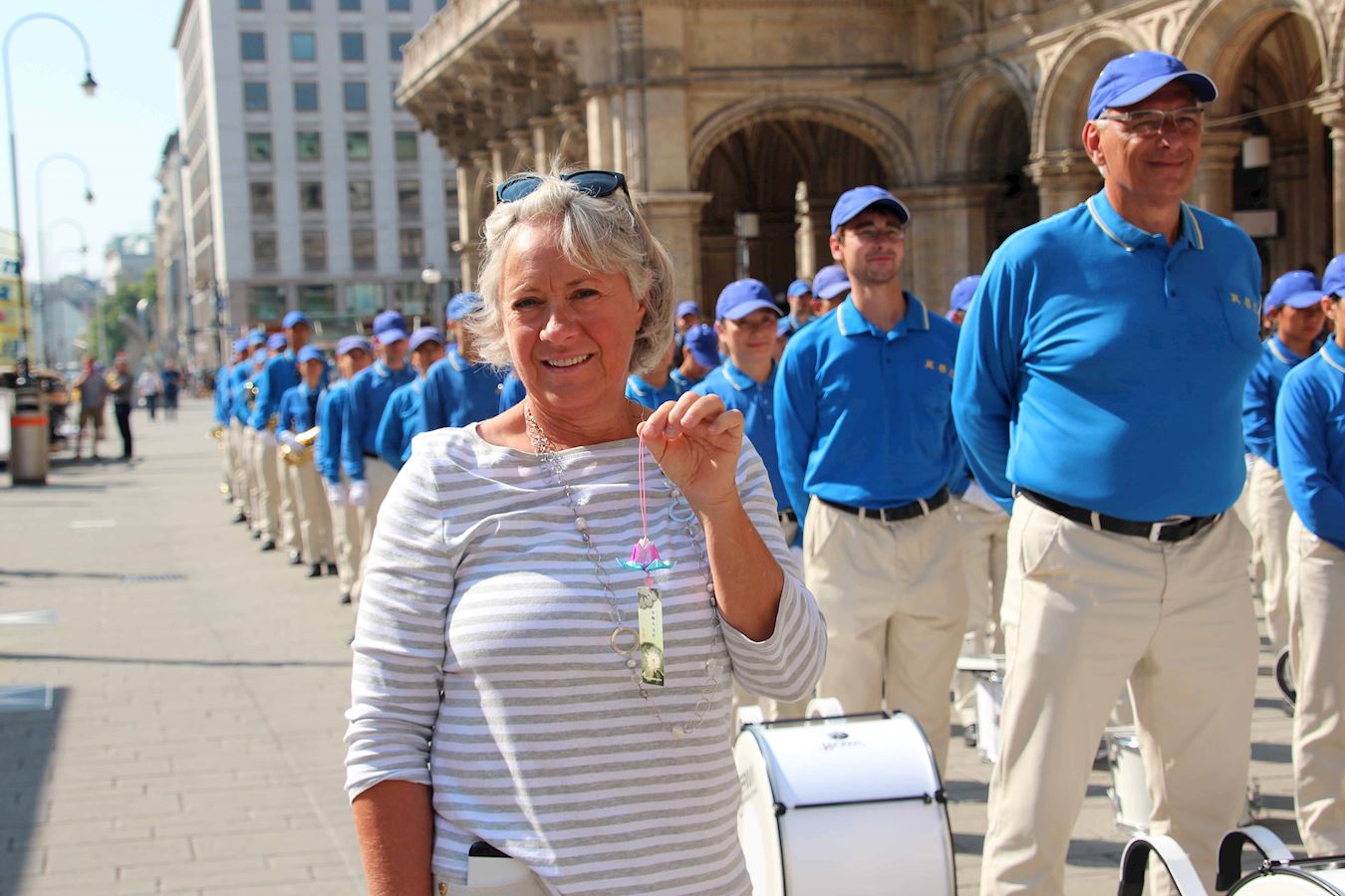 跟着天国乐团的是由西人学员舞动的金龙,身着绚丽唐装的舞蹈队,以及写有醒目的“法轮大法”及“真善忍”的法船,学员的功法演示。曾经在纽约市生活过多年,对中国颇有了解的迈尔(Helga Mayr)太太表示:“我曾经读到过法轮功的讯息,这是我第一次看到他们在一起游行,告诉人们正在发生的,我觉得这是非常美好的事情。我很喜欢那丰富多彩的颜色,那服装。我知道他们是非常传统的人,宣扬传统。”