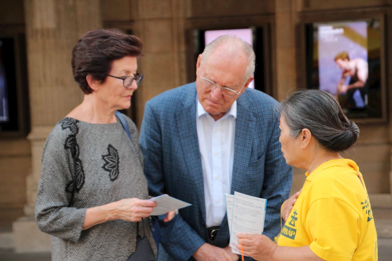 亨兹·洛博尔博士(Dr. Heinz Loeber)介绍自己说在退休前他是一位专攻国际法的律师,所以一直对国际事务还是很感兴趣。他的太太海蒂·洛博尔(Heidi Loeber)退休前是一位艺术家,曾经听说过法轮功学员遭受的种种酷刑折磨,不公的待遇,她认为中共活摘器官的罪行“太可怕,太残忍了”,每个人都应该拥有他们的信仰。