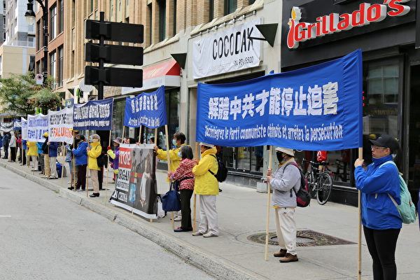 ![]() 图1~4:2020年9月15日,蒙特利尔法轮功学员在市中心圣凯瑟琳大街中领馆楼前拉起一条条横幅,让更多民众认识到中共危害世界的本质。 |