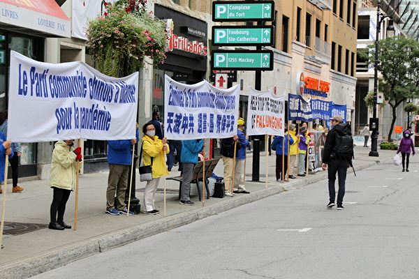 蒙特利尔是一座双语城市,法轮功学员用中英法三种语言制作横幅,内容有“停止迫害法轮功(Arretez la persecution du Falun Gong)”,“Help Stop the persecution of Falun Gong(请帮助制止迫害法轮功)”,“天灭中共,三退保平安(Eliminez le Party Communiste Chinois pervers)”,“解体中共才能停止迫害(Désintégrer le Parti Communiste Chinois et Arretez la persecution)”,“Le Parti Communiste chinois a blame pour la pandemic (中共是大流行病祸首)”等。