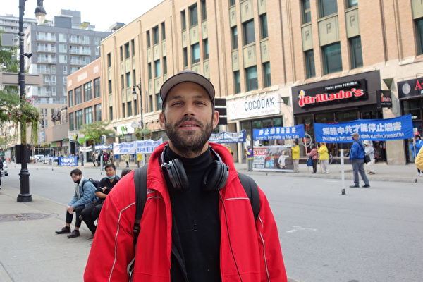 蒙特利尔市民Kris谴责中共活摘器官,“政府做这样的事情,真是邪恶”,“你们能来到中领馆前曝光这件事,非常重要。”