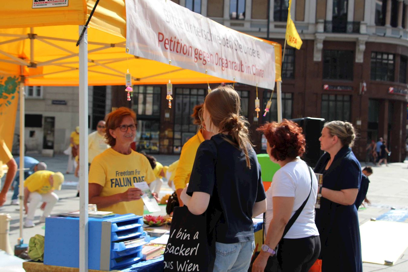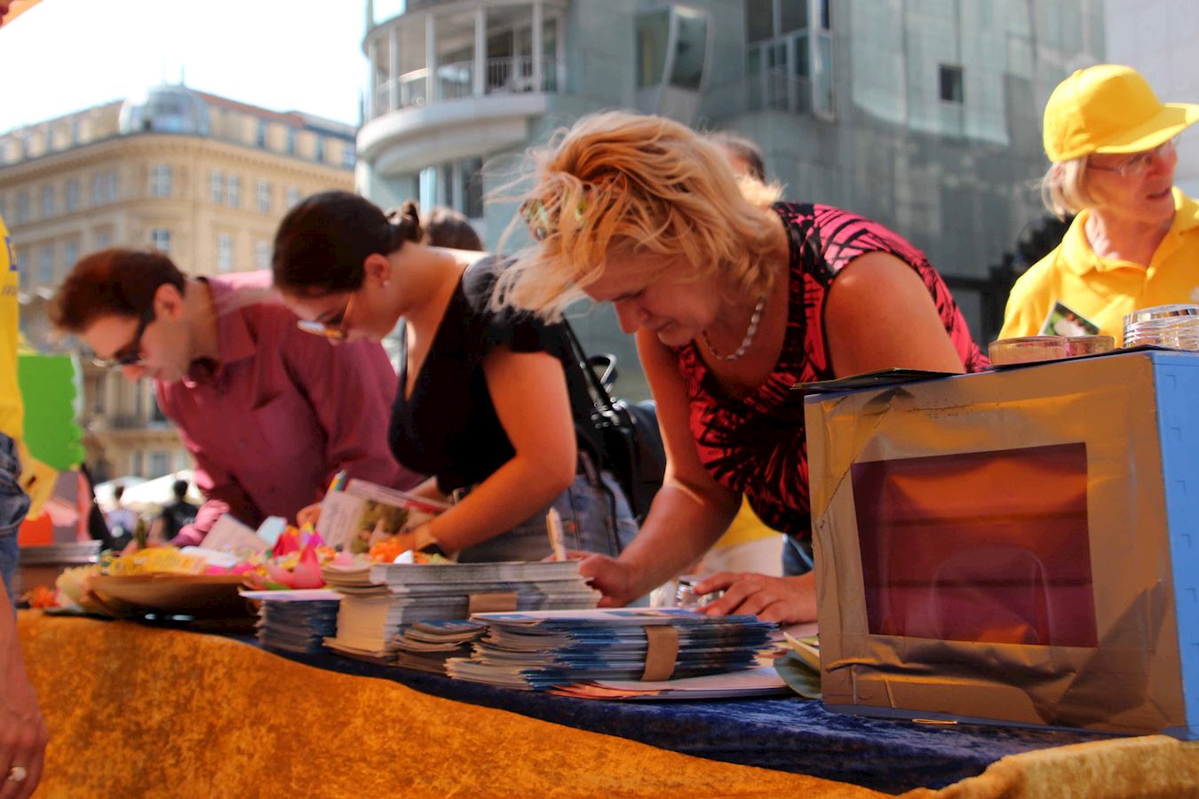 二零二零年九月十三日,在史蒂芬广场又架起了金黄色的帐篷,摆出了介绍法轮功广传世界及常年反迫害的小型图片展,摊开了呼吁奥地利政府帮助制止中共活摘器官及迫害法轮功的征签表。身着黄色体恤的法轮功学员,向路人分发真相资料,介绍法轮大法的美好,也揭露中共对法轮功的血腥迫害。当天还有欧洲天国乐团的表演,给路人送上了听觉上的飨宴。