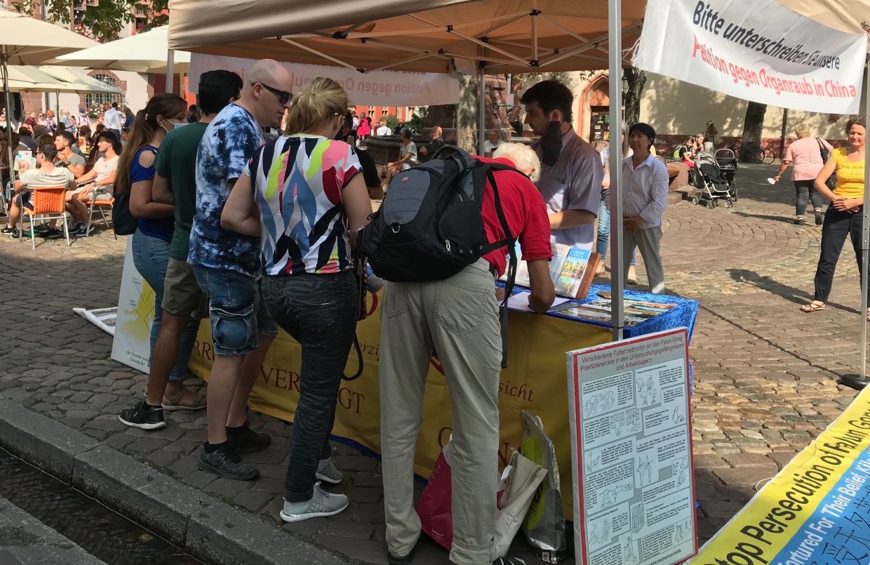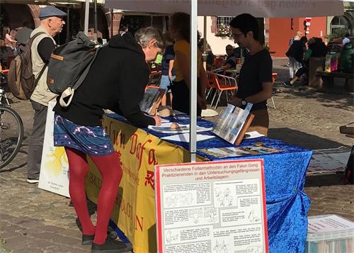 这一天天气晴朗、阳光明媚,又是周末,弗莱堡市中心熙熙攘攘、人头攒动。法轮功学员的信息台位于市中心人流集中的市政厅广场。明黄色印有“法轮大法”“真善忍”的横幅、高高挂在帐篷上呼吁人们签字帮助制止发生在中国的活摘器官的横幅,以及印有大量图片揭露中共酷刑迫害法轮功学员的横幅,吸引了过往行人的目光。很多人停下脚步驻足观看,也有很多人走向法轮功学员询问相关信息。了解了迫害真相的人们纷纷签字支持法轮功学员反迫害。