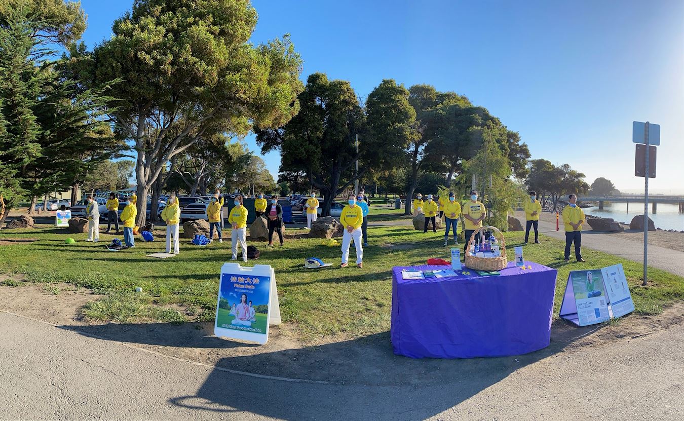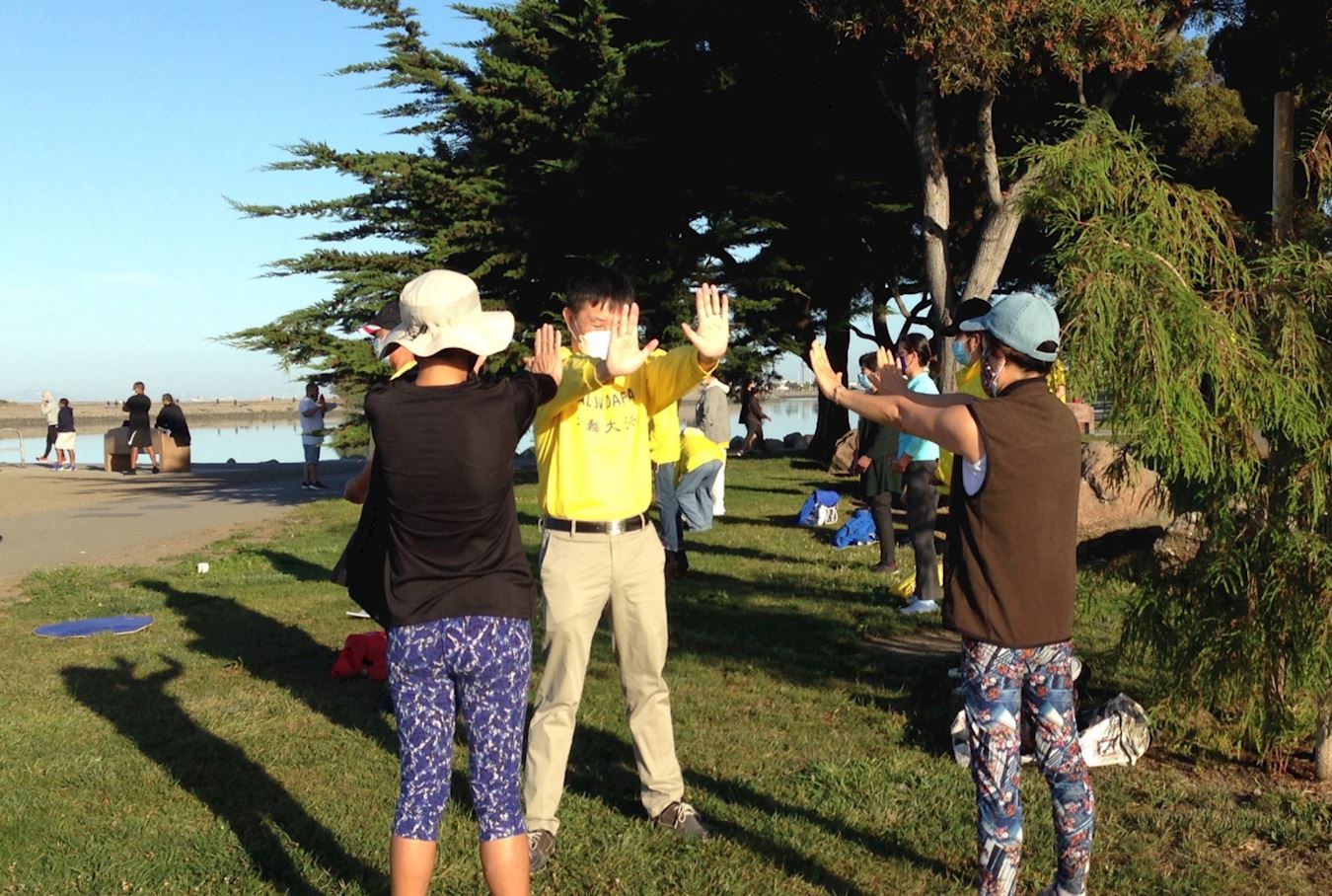 ![]() 图2:二零二零年九月二十六日,旧金山东湾地区的法轮功学员来到风景如画的圣丽安珠(San Leandro)海边公园集体炼功弘法。 |