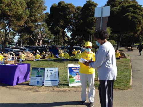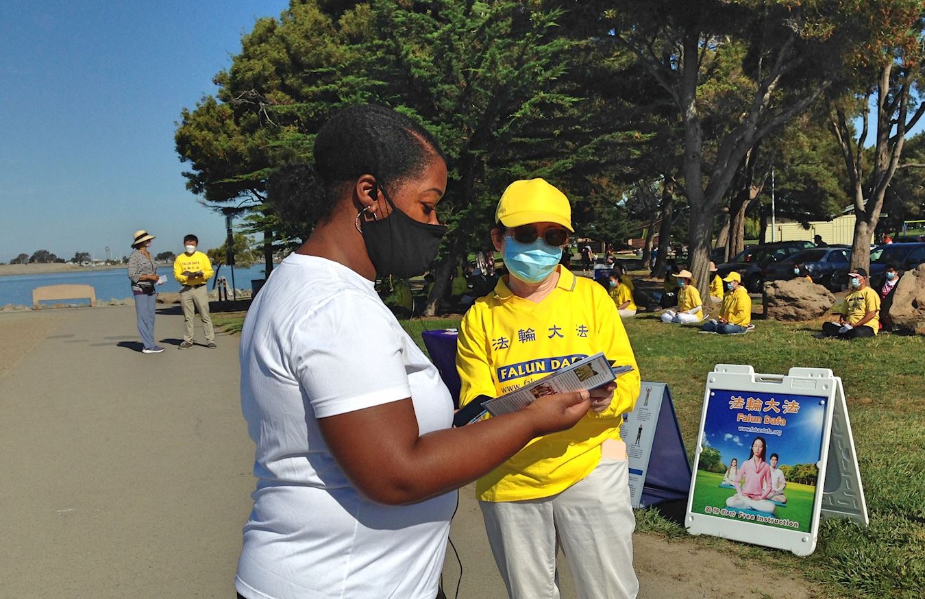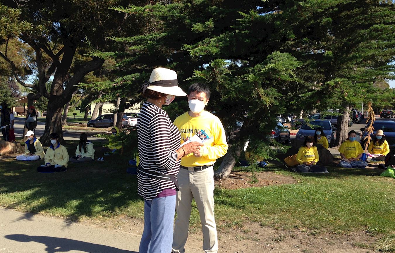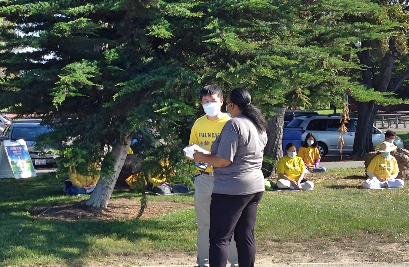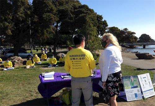 一位白人女士在久久观看学员炼功后,也走上前来了解真相。听完学员的介绍后,她说:“现代社会就需要像法轮功这么祥和的功法。”学员给她介绍,这么祥和的功法,在中国大陆却是不被允许的 。她对此感到很震惊。但当听到是中共在迫害法轮功时,她一下子就明白了为什么。她并询问了多个关于炼功的具体问题,如需要多少时间炼完五套功法等。最后,她要了炼功点的具体信息,并表示下周末要到炼功点学功。