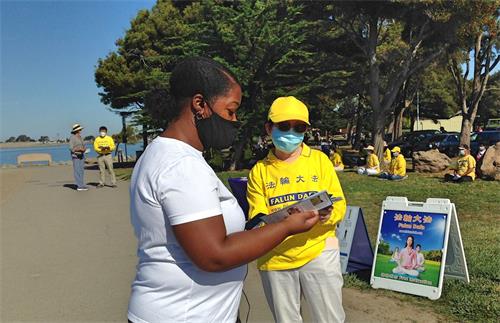 两位非裔女士路过时,感受到炼功场强大的能量,于是停下了脚步,在炼功场边相互谈论人体的“气”和能量。学员走过来给她们介绍法轮功,她们认真听完,表示非常感兴趣,下周就要到炼功点来学功。