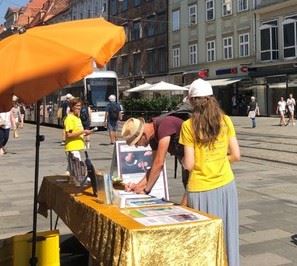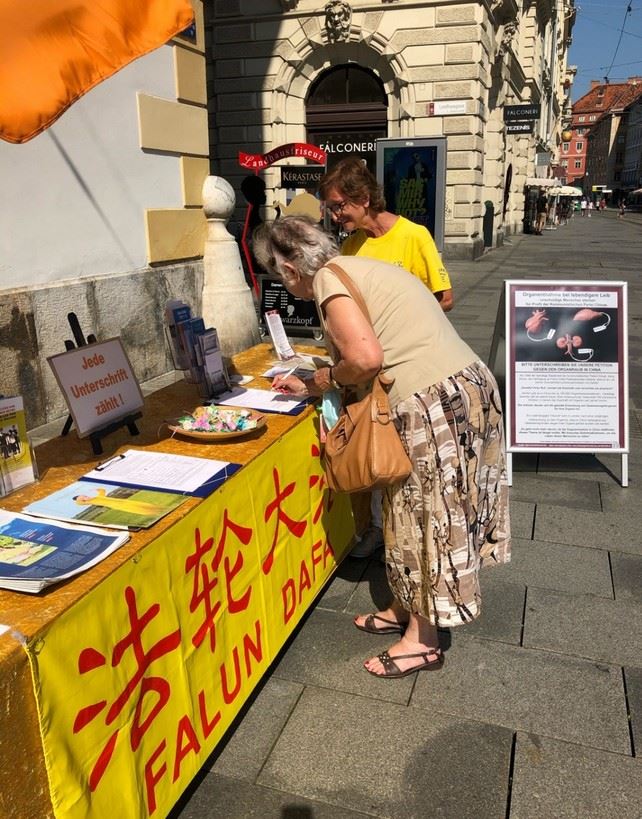 一对年轻人在反对迫害和反对活摘器官的征签表上签了字。他们来自意大利,要了很多英语和意大利语的真相资料。那位年轻男士目前在格拉茨的一家大企业工作。他觉得只要中国(中共)政府还在犯罪,就应该停止和他们合作。