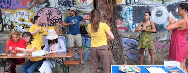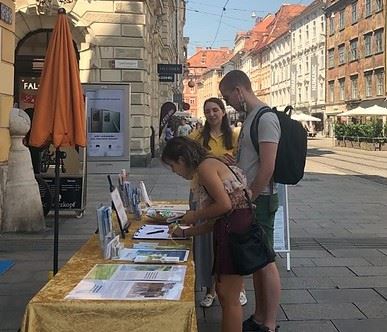 二零二零年八月三十日,法轮功学员受邀参加一年一度的穆尔河文化节。沿着这条流经格拉茨的穆尔河,法轮功学员搭建了不同的展台。很多游人主动前来了解法轮功,有的还兴致勃勃的学炼功法。