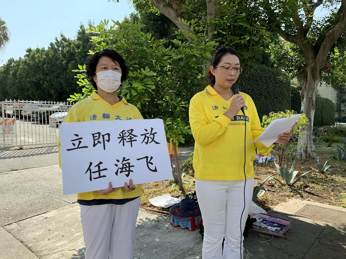 为了营救六月份在中国遭到非法抄家的先生同修任海飞,法轮功学员王晶在集会上谴责中共的迫害,并表示非常担心先生的安危。