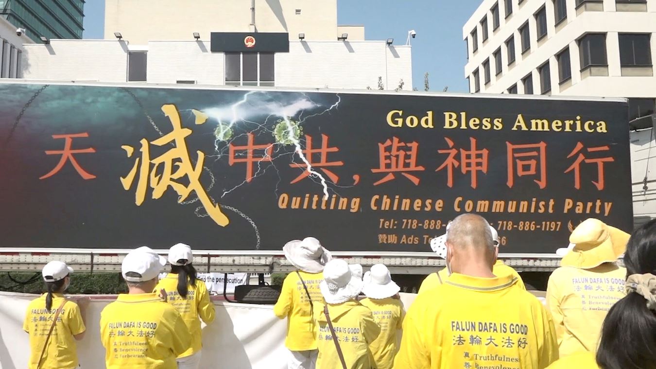 活动过程中,法轮功学员制作的一辆两面挂着“法轮大法好 真善忍好”,“天灭中共 与神同行”的巨型横幅的大卡车,在洛杉矶中领馆前绕行。在当前瘟疫仍然传染的危险中,告诉人们自救的良方。