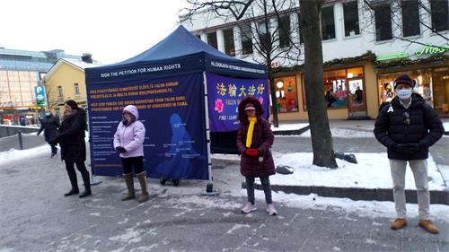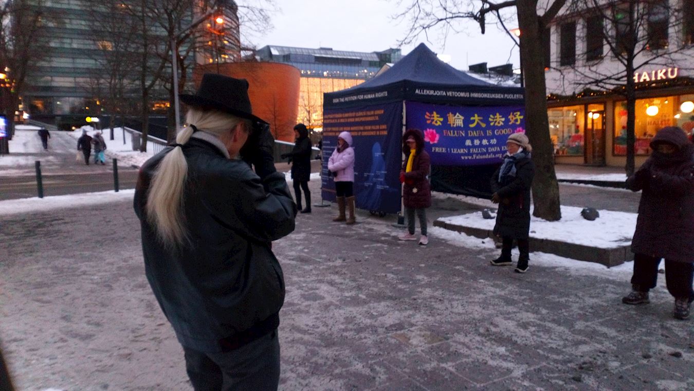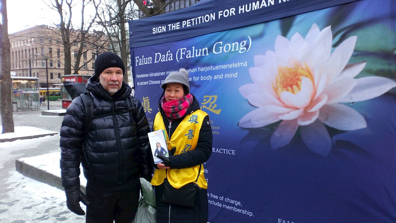 医生塔帕尼·沃拉(Tapani Vuola)从商店出来,他招呼学员问道:“你知道吗?赫尔辛基跟北京是友好城市。你们应该去跟赫尔辛基的政府部门讲,他们做了迫害人权的事情,不应该建立什么友好城市关系。你们应该跟各个芬兰议员去讲。”他还告诉学员说:“中共是一个独裁政权,不尊重人权。不尊重信仰自由的权利。迫害法轮功并活摘器官。而且中国是执行处决死刑犯最多的国家。让人非常遗憾!”