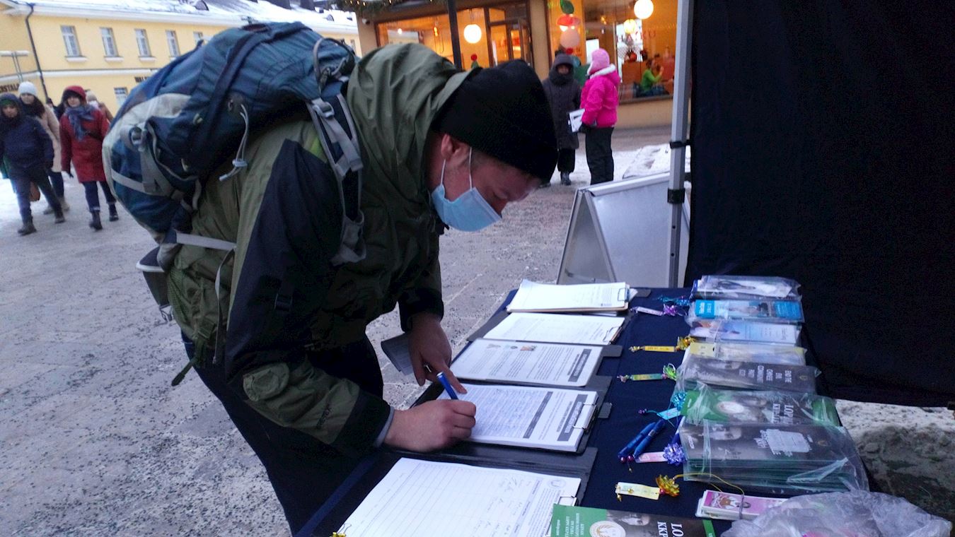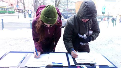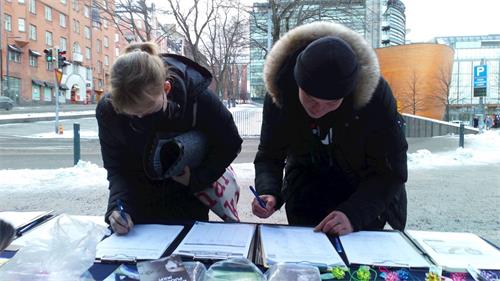 当天零下六度,街上行人还是络绎不绝。有熟悉法轮功学员的市民过来跟学员打招呼问好,也有明白真相的人径直走到桌子前签字,支持法轮功学员多年的和平反迫害。
